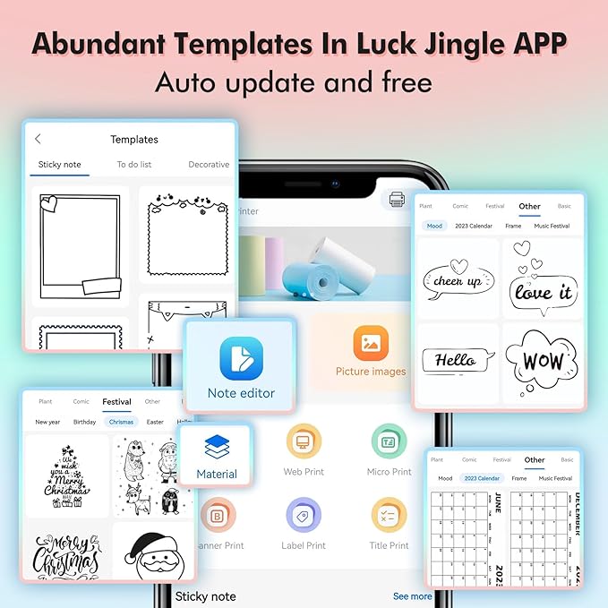 • Thermal Sticker Printer no longer requires cartridges and ink, just one roll of thermal paper.They typically connect via Bluetooth or Wi-Fi, allowing users to print directly from their smartphones or tablets for convenience.We also come with 6 rolls of 57 * 30mm printed stickers. 3 rolls of white, 3 rolls of color (pink, blue, yellow).