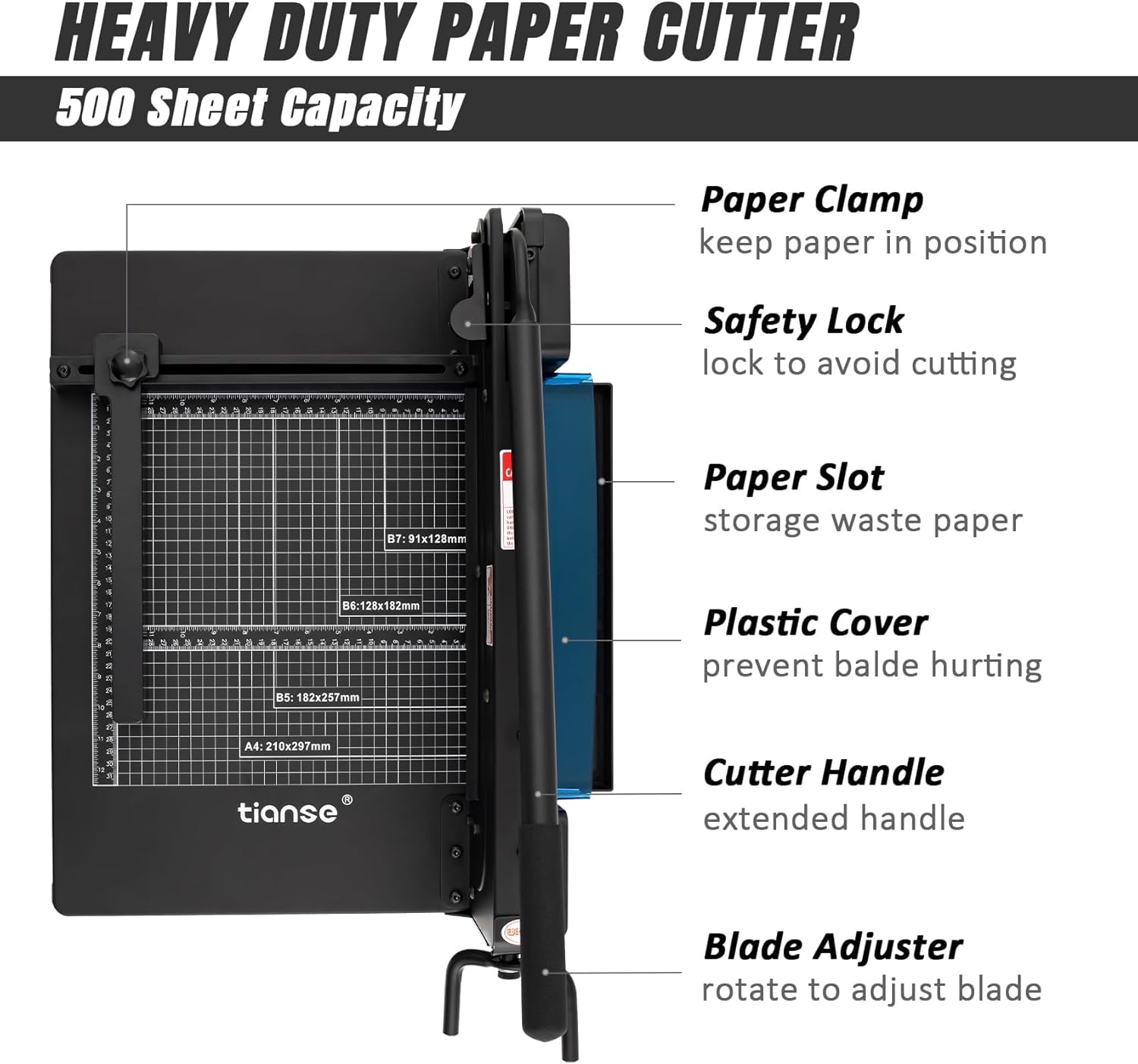 TIANSE Heavy Duty Guillotine Paper Cutter A4 12" Guillotine Paper Cutter 500 Sheet Capacity Solid Steel Construction with Double Safety Protection Perfect for Trimming Paper Cardstock Matboard Black