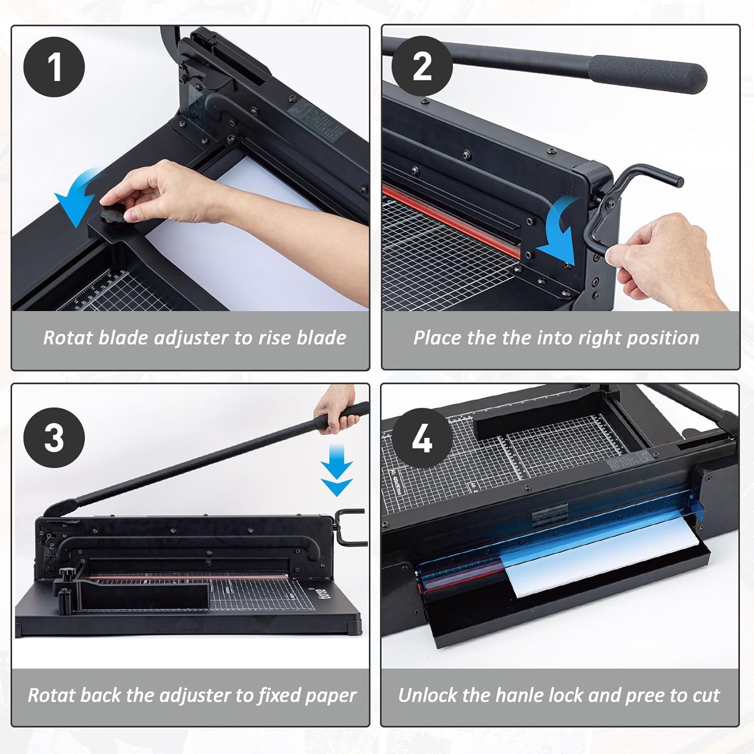 • Safety Lock Design : The security lock on the paper cutter heavy duty is lock to anti handle and blade cut down when placing paper; For safety we have posted a warning message on the paper cutter; please pay attention to the warning message when using it