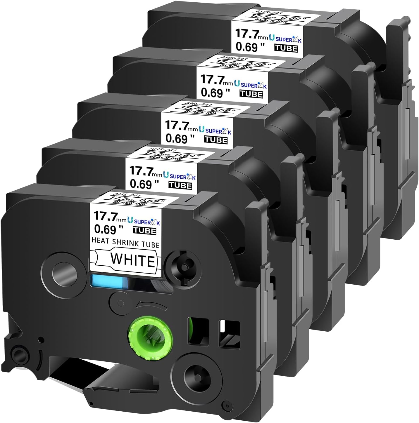 USUPERINK 5PK Compatible for Brother Ptouch HSe-241 HSe241 HS-241 HS241 Black on White 17.7mm 0.69'' Heat Shrink Tubing for Wire Cable for PT-D400 PT-E500 PT-P700 PT-P710BT PT-P750W Label Maker Tape