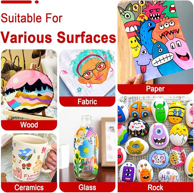• Working on Any Surface: Our acrylic dual tip markers are suitable for use on almost all surfaces, including ceramic, wood, fabric, stone, metal, plastic, canvas, shoes, eggs, paper, clothes, models, leather, create DIY arts and crafts graffiti projects on a wide variety of surfaces to your heart's content
