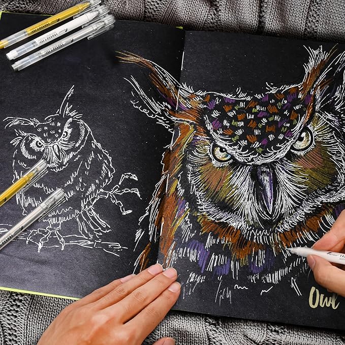 • Multi-Purpose - Writes on dark paper such as black paper, craft paper. White fine point gel pens for detail drawing sketching coloring, illustration, card making, scrapbook and other projects.