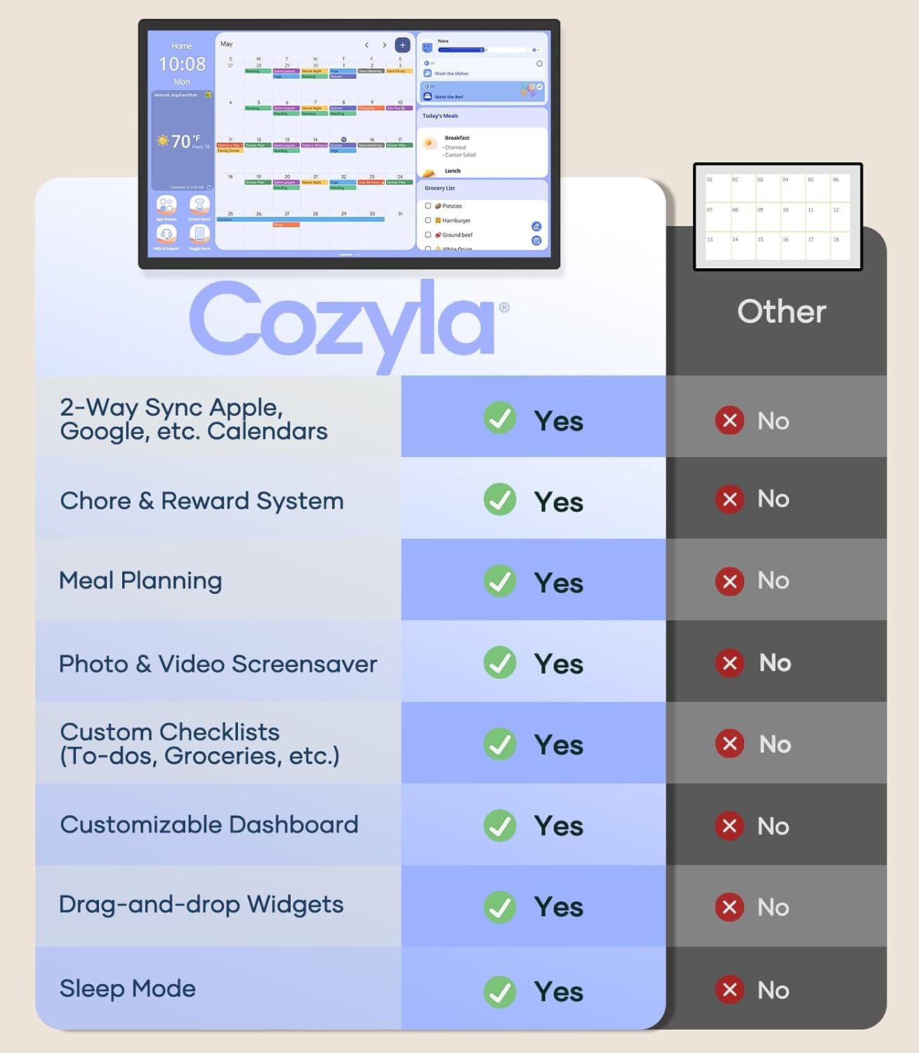 • Simplify Your Life: Make family life easier with our family calendar electronic. It works seamlessly with the Cozyla+ mobile app, so you can manage schedules and update events anytime, anywhere.