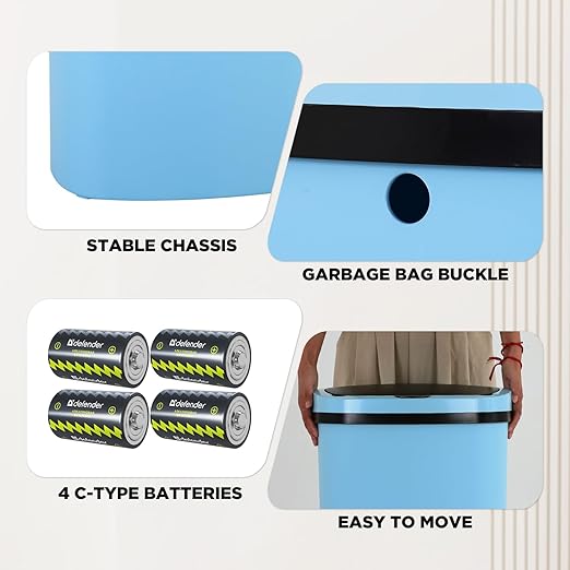 • Power Saving: Equipped with a motion sensor, the trash can operates efficiently with just 4 C-TYPE batteries, allowing for long-term usage without frequent replacements. It's designed to save energy, making it convenient for everyday use.