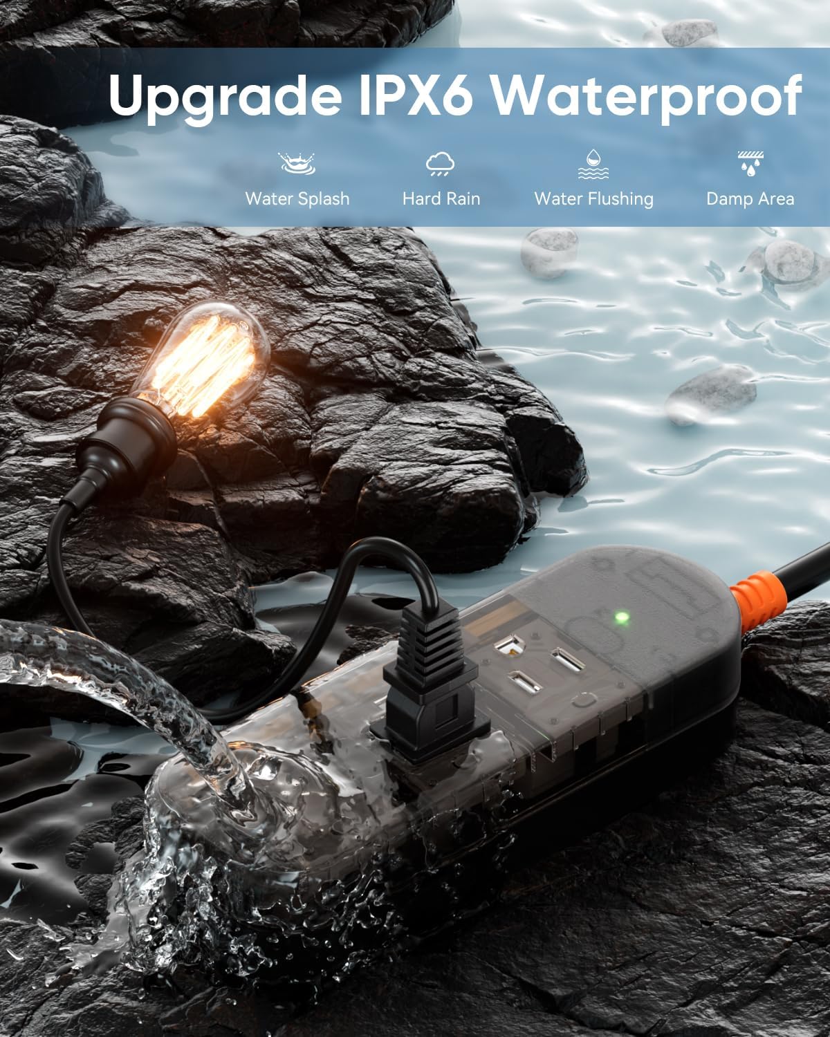 • 【Versatile & Weatherproof】Welcome to our IPX6 rated power strip, resistant to rain, water splashes, and flowing water. It reroutes any liquid intruding the sockets through the back, ensuring functionality in environments like kitchens, outdoors and more.