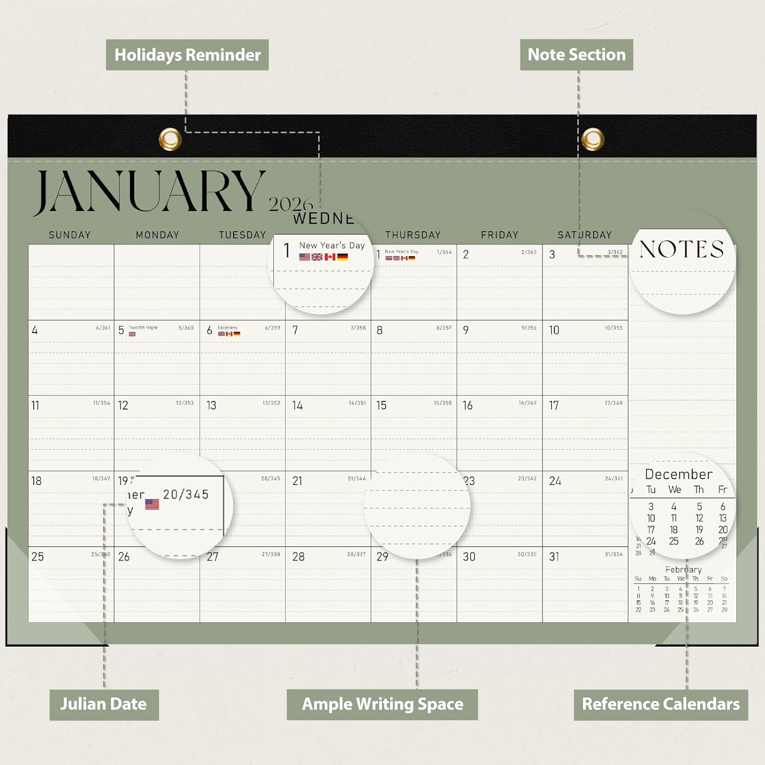 • [2025-2026 DESK CALENDAR] – Running until to December 2026, the desk calendar highlights holidays and Julian dates to keep you on track. Each month features two reference calendars for easy review of past and upcoming dates—perfect for managing long-term projects, school schedules, and work plans.