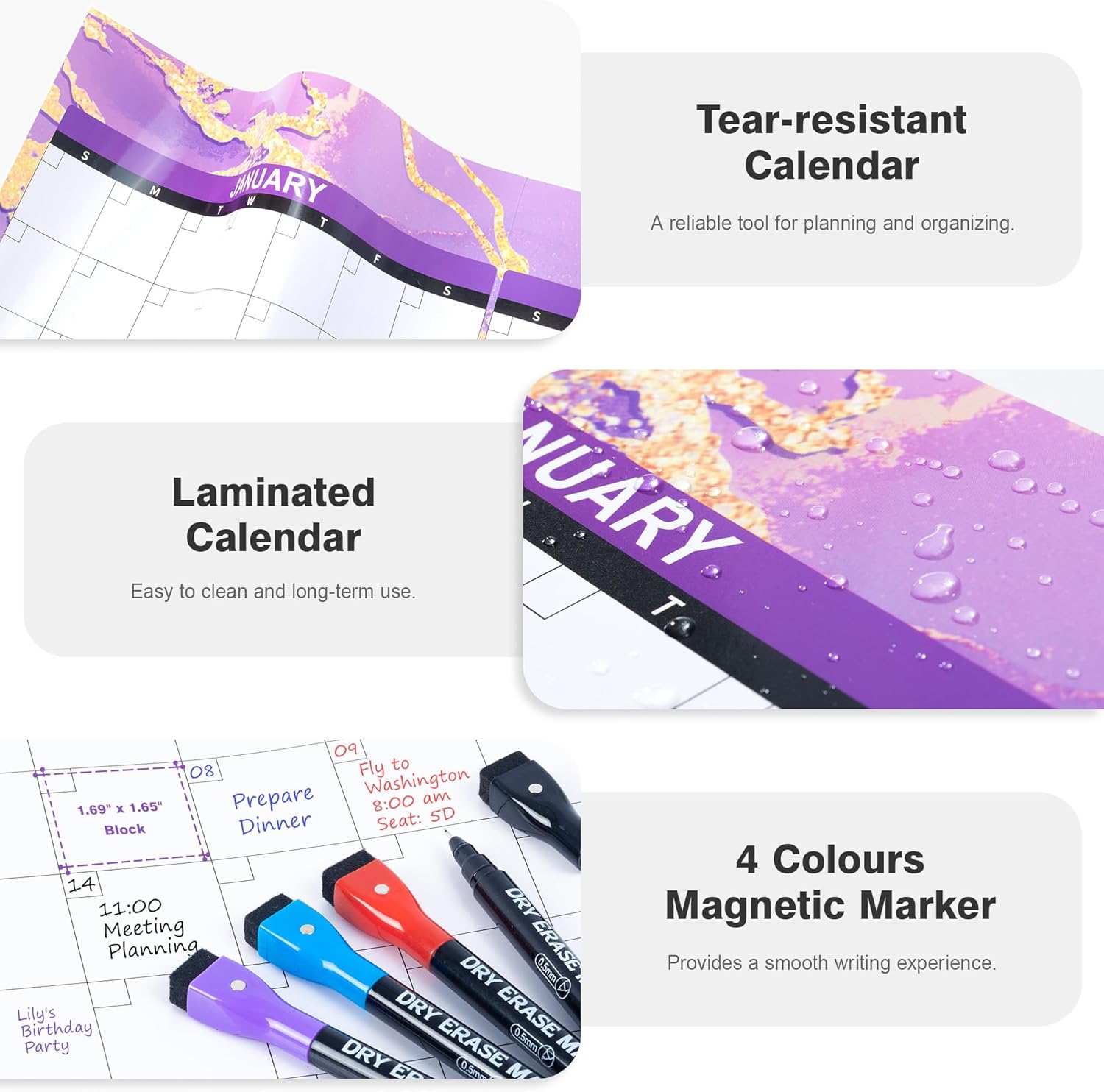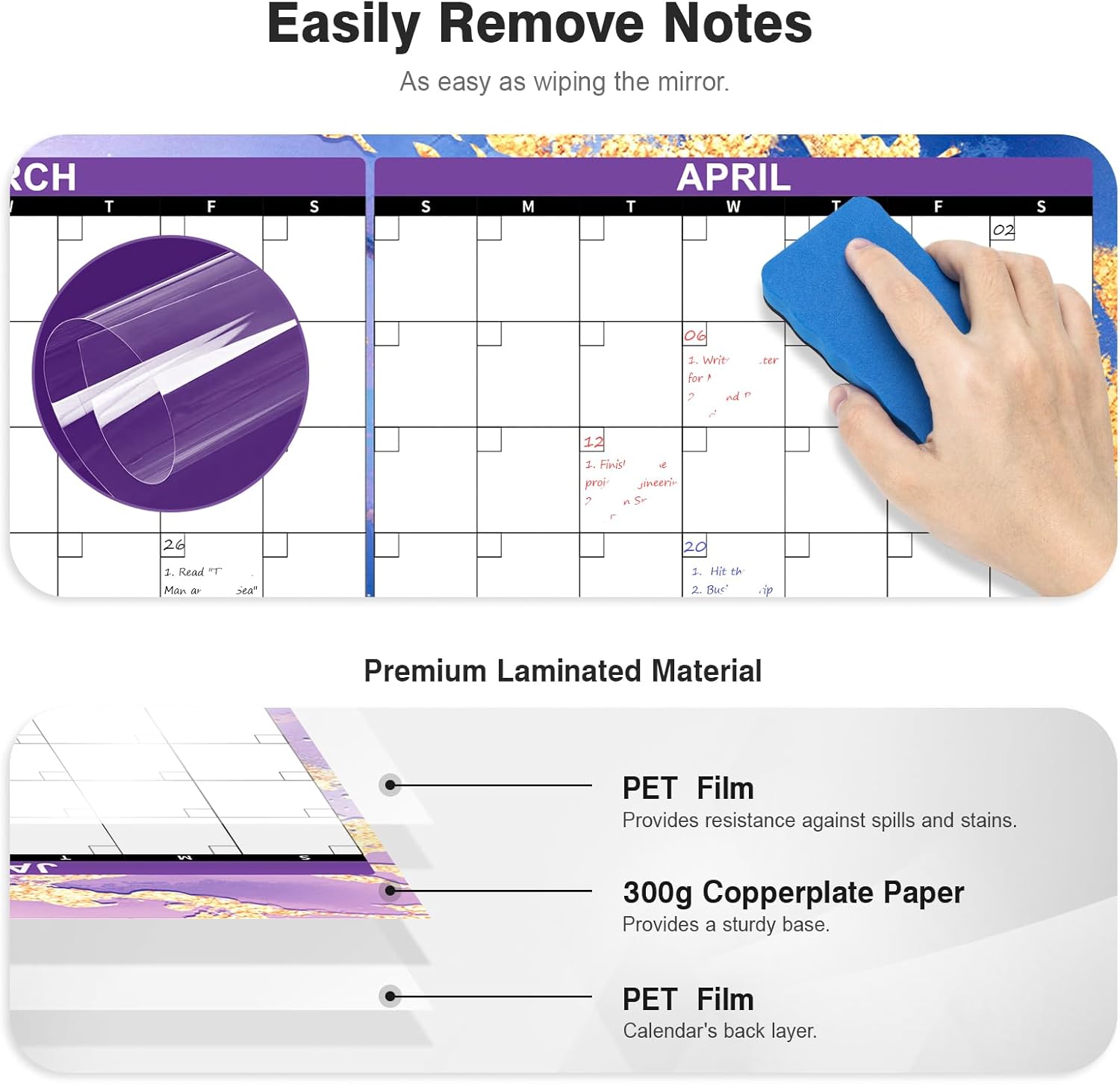 • ✨ Dry Erase Wall Calendar : is made of PET Film and 300 grams Copperplate Paper, providing a durable surface that resists scratches and smudges, while the sturdy Copperplate Paper backing keeps it in place without curling.