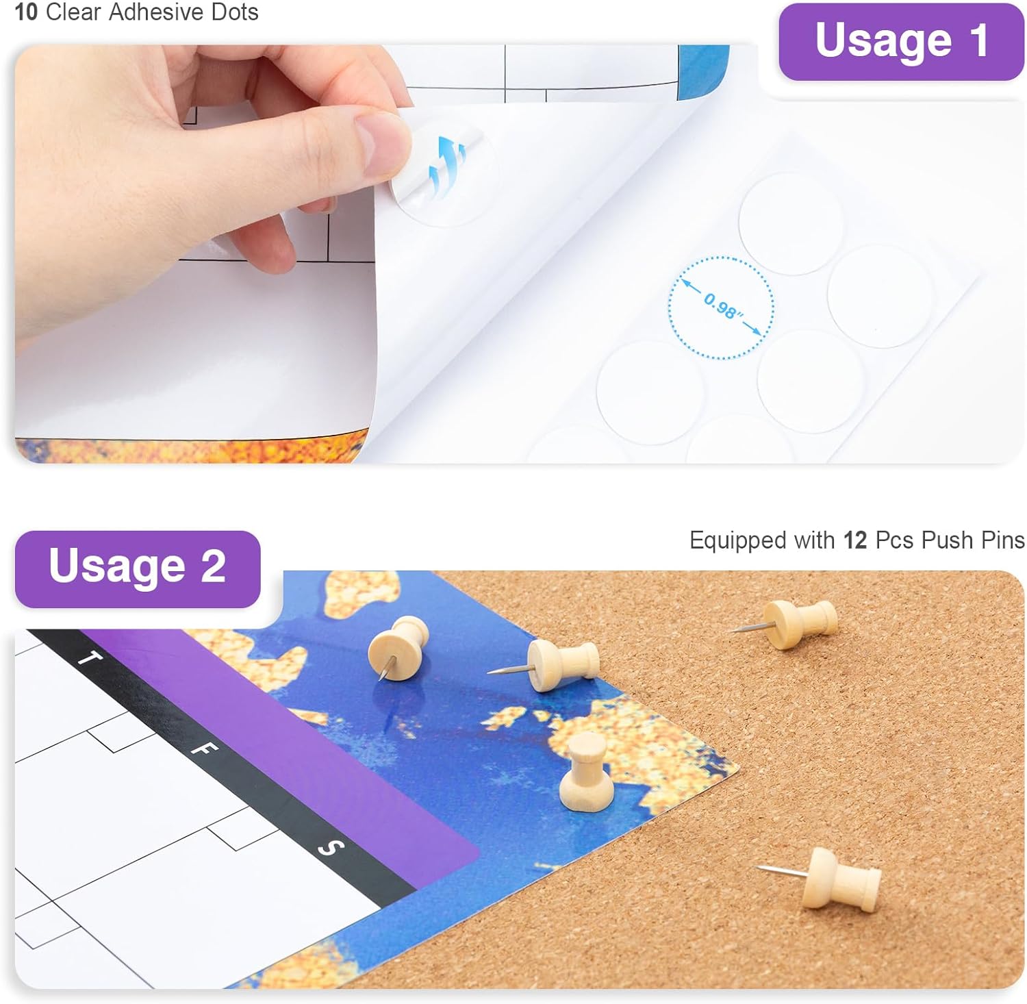 • ✨ Undated Laminated Calendar: This waterproof wall calendar comes with a mini eraser, four dry-erase markers, 10 push pins, and 10 transparent round stickers. The undated monthly calendar can be started at any time, making it perfect for long-term use.