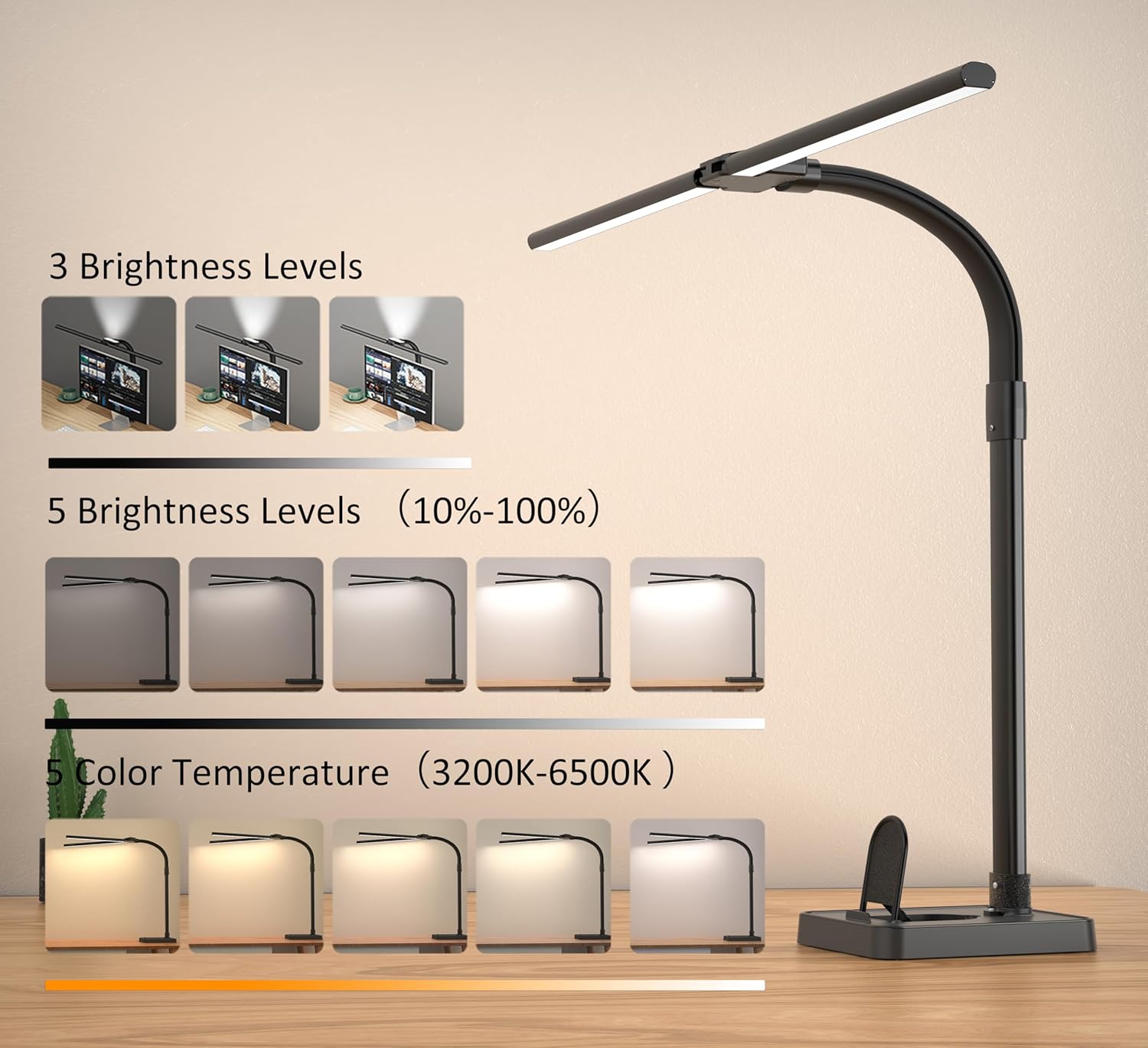 • 【Super Wide, Large and Bright】 This 24W LED desk lamp has a double head design that allows you to adjust the angle of the light bar. It can extend to 31.5 inches and fully illuminates the table. Suitable for multi-monitor workstation, home office, large desk, study, architect, computer, drawing, sewing, crafts, painting, reading, gaming, piano. Height up to 32.7 inches. The best LED desk lamp for working from home