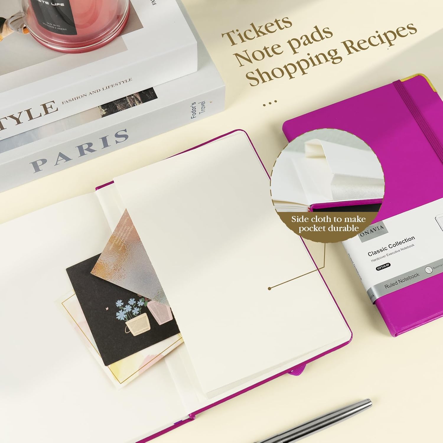 • Humanity Detail Design: A5 Hardcover Journal Note Book features an elastic pen loop, making it more convenient to carry pens of various sizes. The elastic closure band let the hardcover notebook open and close freely. 1 Expandable inner pocket can easily store notes, bills, receipts, appointment cards, and more. And 1 ribbon bookmark helps quickly find the correct page