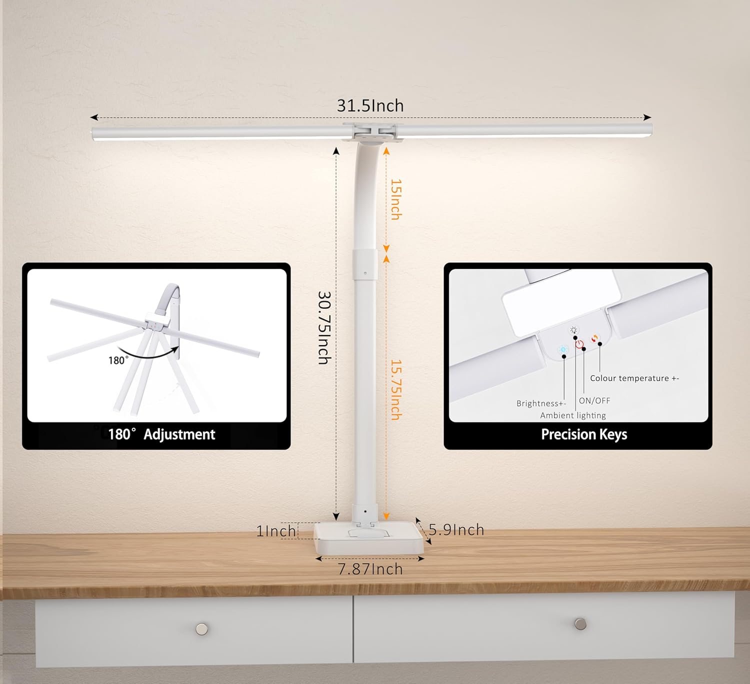 • 【Super Wide, Large and Bright】 This 24W LED desk lamp has a double head design that allows you to adjust the angle of the light bar. It can extend to 31.5 inches and fully illuminates the table. Suitable for multi-monitor workstation, home office, large desk, study, architect, computer, drawing, sewing, crafts, painting, reading, gaming, piano. Height up to 32.7 inches. The best LED desk lamp for working from home
