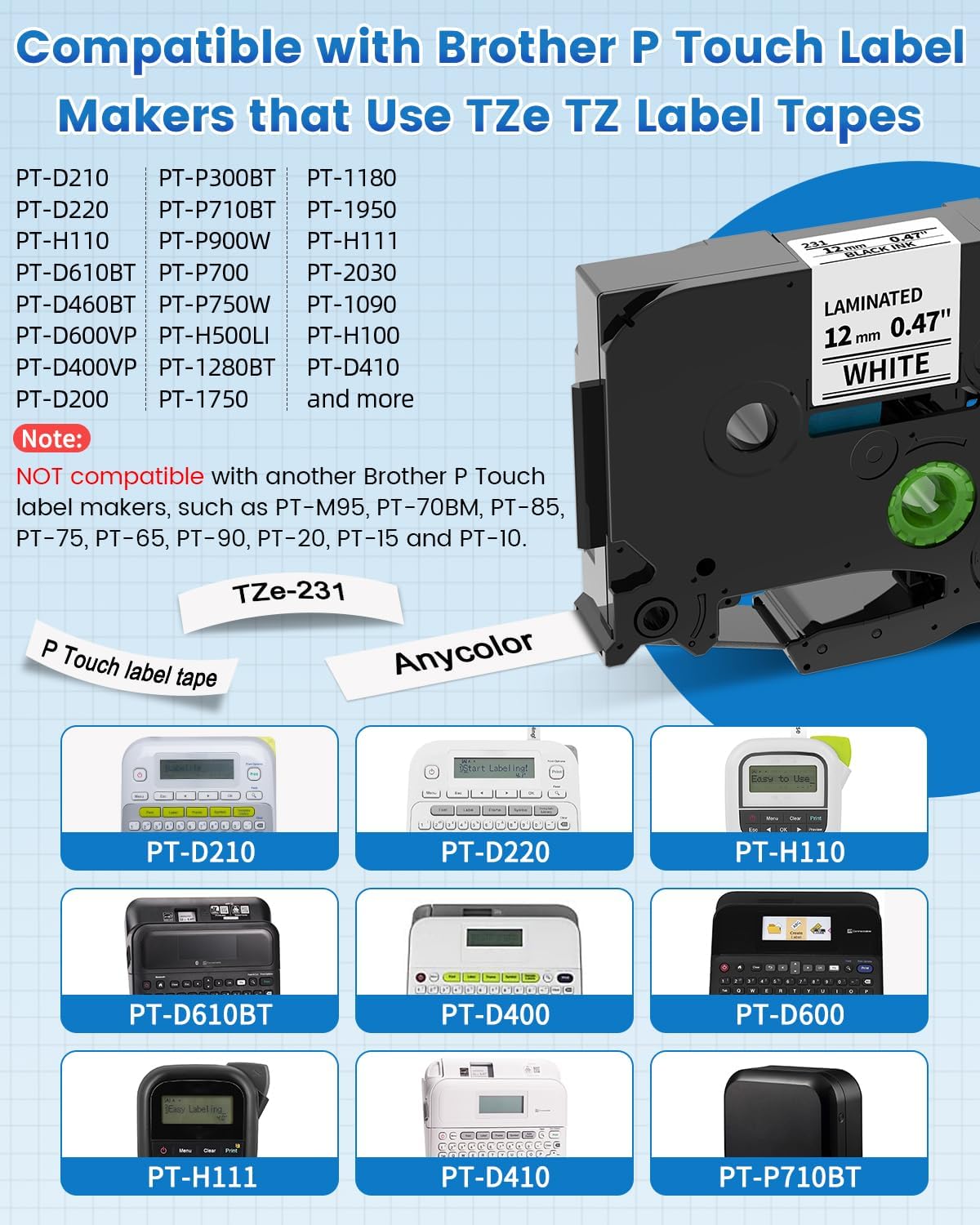 • Compatible with following Brother P Touch Label Makers that Use with TZe TZ Tapes: PT-D210, PT-D220, PT-H110, PT-D600, PT-D610BT, PT-D400, PT-D410, PT-D460BT, PT-D200, PT-P710BT, PT-310BT, PT-1880, PT-H111, PT-1090, PT-1280, PT-1750, PT-1950, PT-P700, PT-P750W, PT-2030, PT-1900, PT-1290, PT-H100, PT-E100, PT-H300, PT-H500LI, PT-D400AD, PT-D400VP, PT-D450, PT-D600VP, PT-D200G, PT-1190, PT-1230PC, PT-1880SC, PT-1880W, PT-1890SC, PT-1890W, PT-2430PC, PT-6100, PT-D800W and more