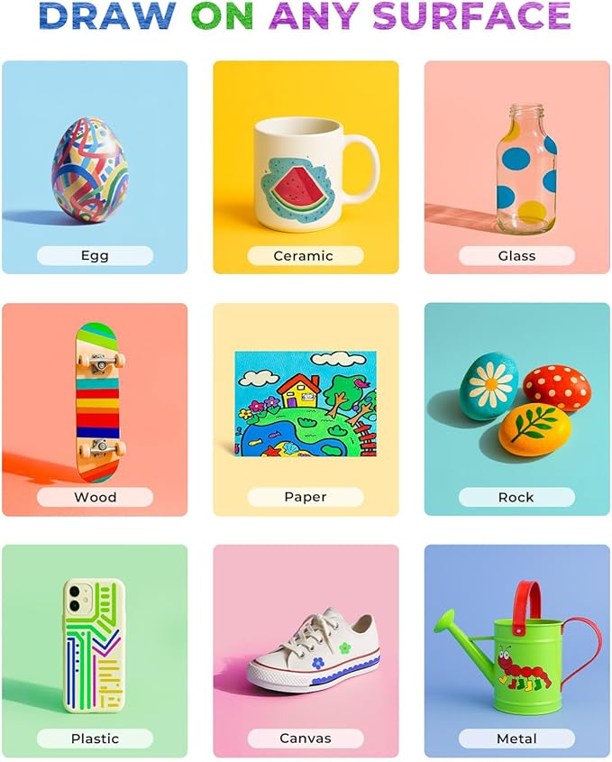 • Works on Various Surfaces: This acrylic marker works on nearly all surfaces, meeting the needs of professional creators. Whether it's rocks, canvas, fabric, ceramics, glass, wood, eggs, plastic, or ornaments, you can easily bring your creative ideas to life. Start your DIY craft or doodling projects anytime and enjoy the fun of artistic expression