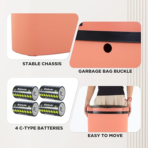 • Power Saving: Equipped with a motion sensor, the trash can operates efficiently with just 4 C-TYPE batteries, allowing for long-term usage without frequent replacements. It's designed to save energy, making it convenient for everyday use.