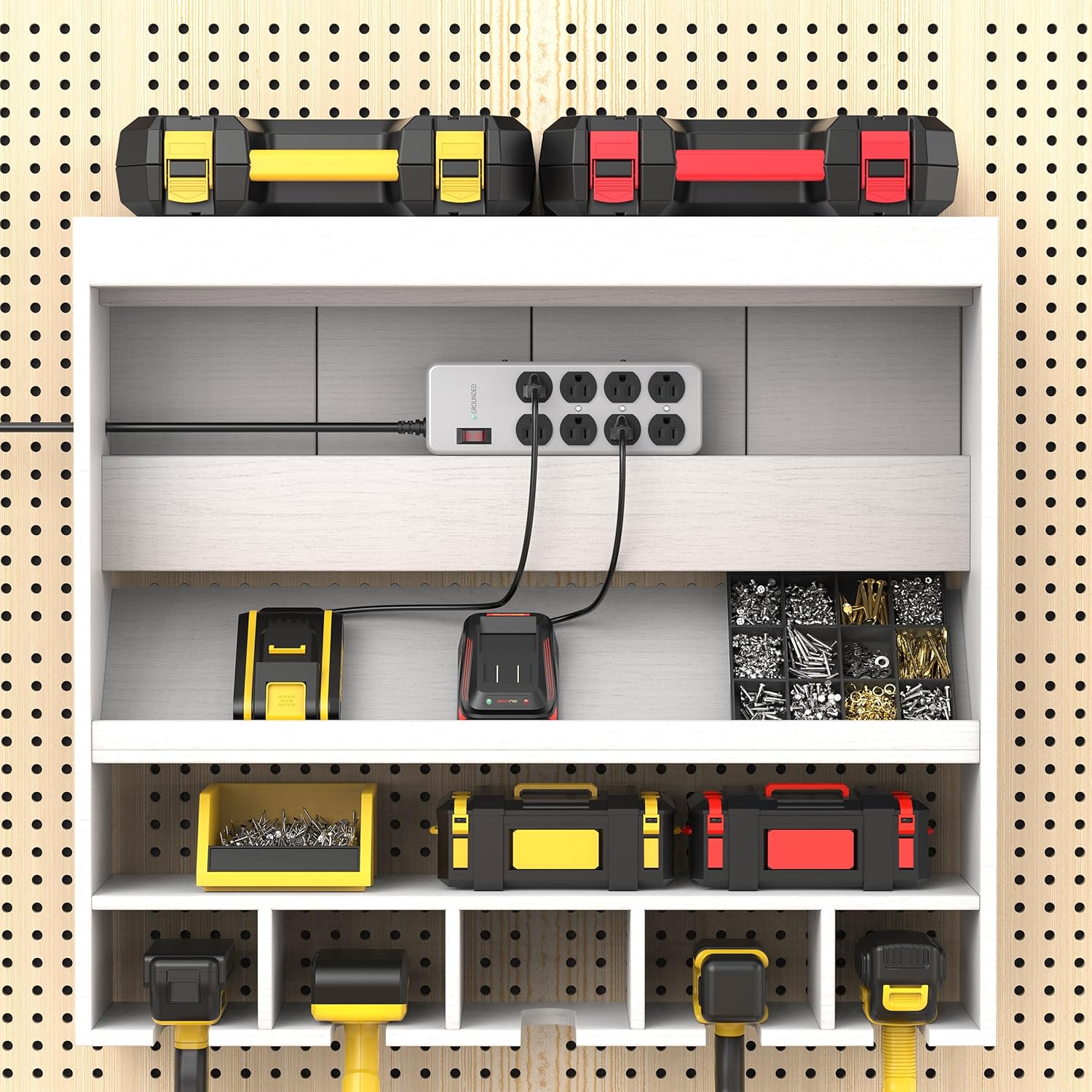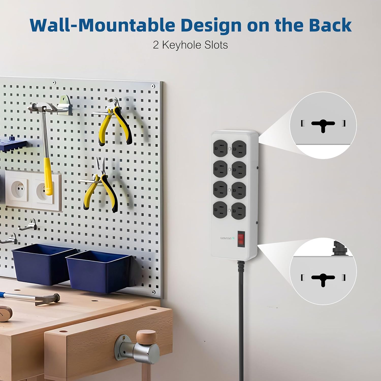 • Effortless Installation and Storage: This wall mountable power strip with switches features a hanging hole design, making it super convenient for any workspace. Use the hanging hole for storage addresses the need for a workbench or garage power strip wall mount, ensuring a tidy and accessible work area.