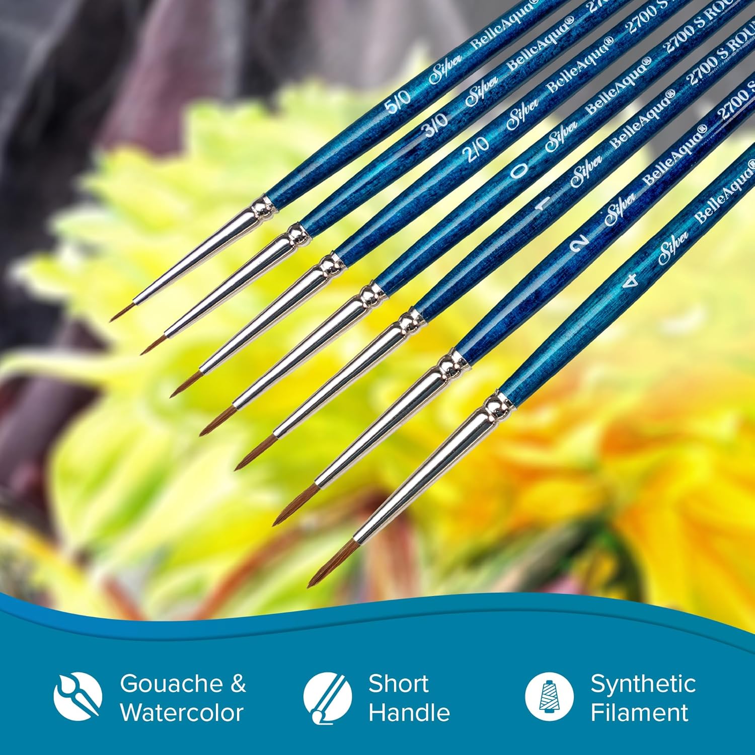 Silver Brush Limited BA-2707S BelleAqua Watercolor Detail Set, 5pc Professional Short Handle Watercolor Brush Set with Soft Synthetic Red Sable Bristles, Round, Bright, Liners & a Dagger Striper Brush