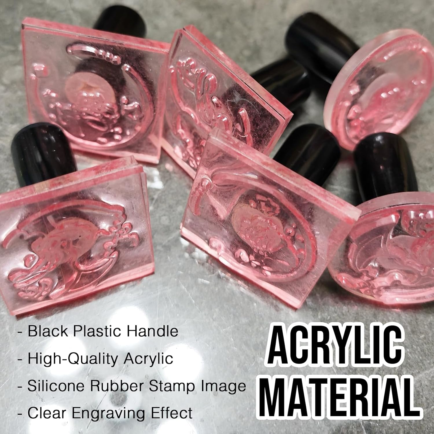 • Premium Material Options: Experience exceptional quality with our custom stamps. You can choose between rubber stamps mounted on sturdy maple wood for a classic feel or sleek acrylic stamps with comfortable plastic handles for a modern touch. Our stamps are designed for both personal and professional use, ensuring durability and outstanding performance with every impression