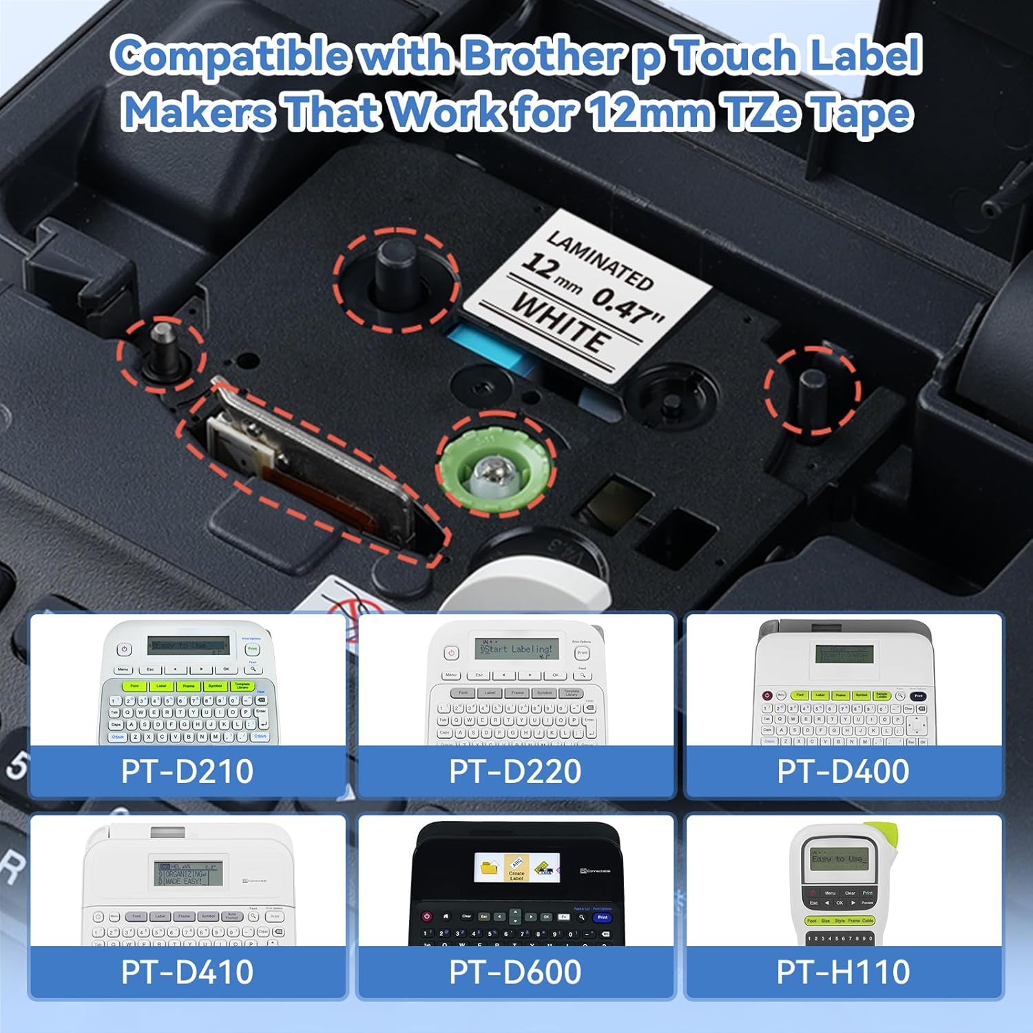 • 【Compatible with Brother P touch Label Maker】 PTD220, PTD210, PT-D200, PT-1830, PTH110, PTD200, PT 1880, PT 1750, PTH110BP, PTH111, PT-H100, P300BT Cube, PT-D200G, PT-H101GB H101C H100R H101LB H75 H100 H101 H105 H107 H107B H108 H110 H200, PT-900 1000 1005 1080 1010 1250 D200 D210 D400 E100 E110 GL200, PT-P700 P750W PT-1090 1230 1250 1290 2100 2430PC PTE100VP, PT105WB PT-H300 H300LI H500LI, 1190 PT-11Q PT-1230PC 1880C 1880SC 1880W 1890C 1890SC 1890W 2430PC PT-6100 PT-D200 D200G D210 PT-D400 D400AD D400VP D450 D600 D600VP D800W