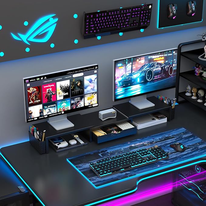 • 【Ample Storage Space】The dual monitor stand features two magnetic pen holders and a drawer, allowing you to easily organize your desk accessories and office supplies, keeping your workspace clear and tidy for easier access.