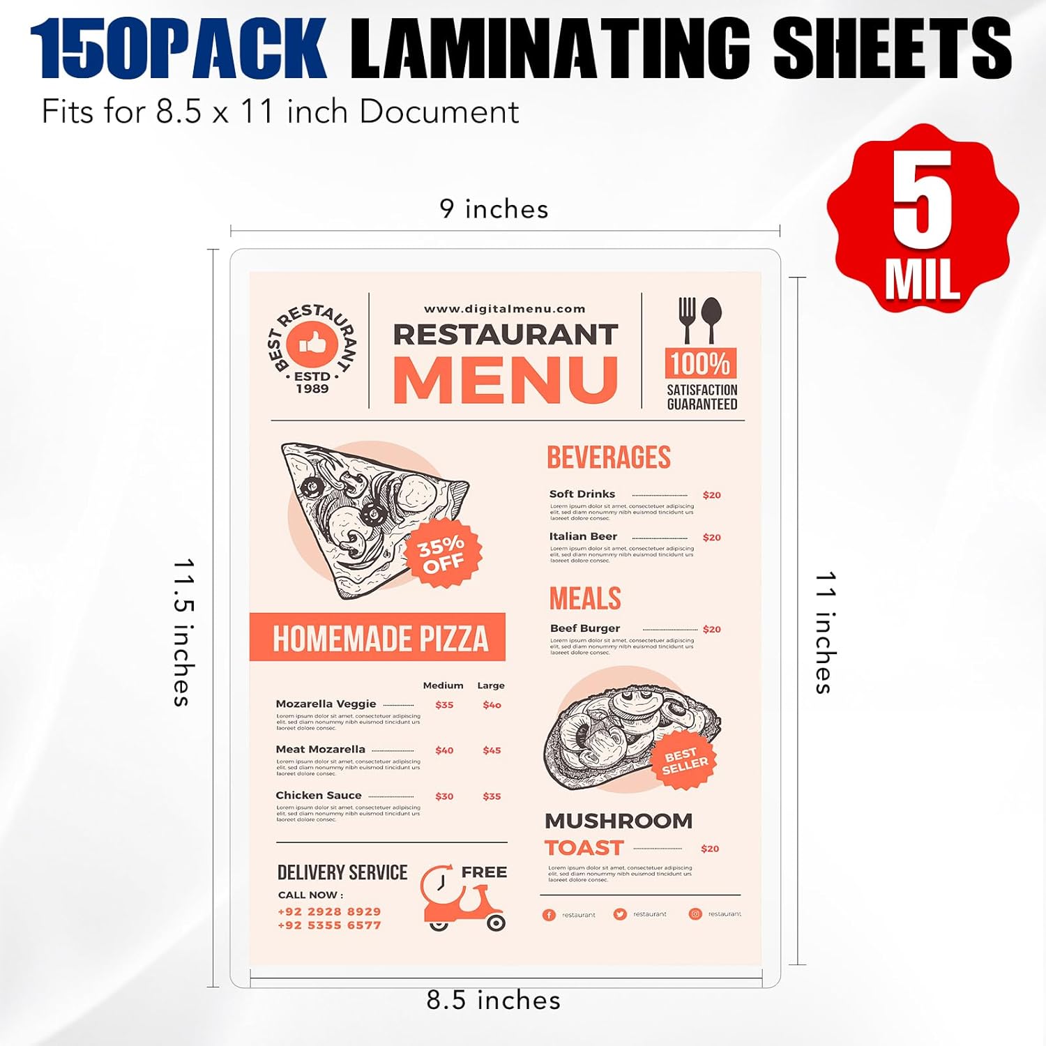• LAMINATING POUCHES DIMENSIONS: 150 PACK, 9" x 11.5",5 Mil thickness. Compatible with all thermal laminator machine brands. Suitable for letter-size files up to 8.5 x 11 inches.
