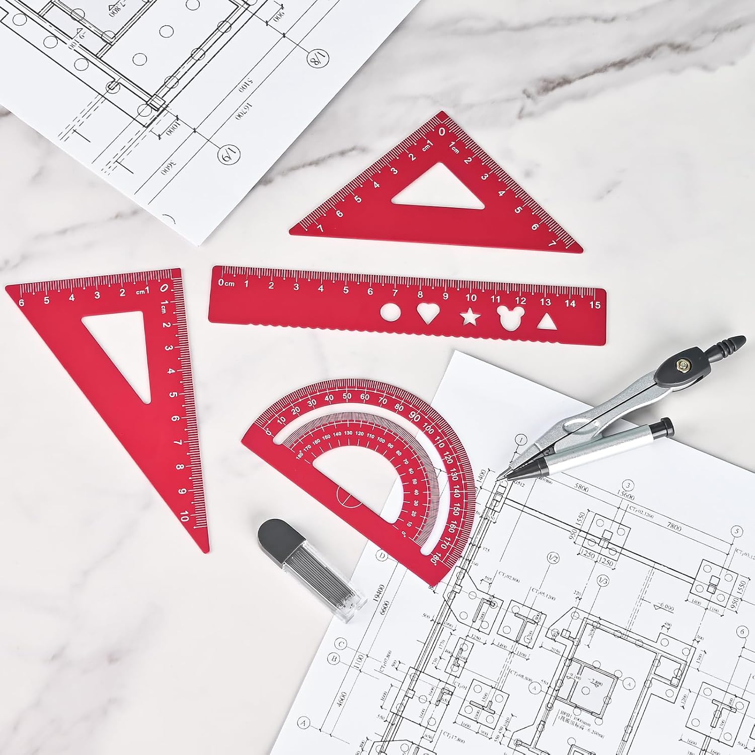 6 Pcs Metal Geometry Set, Math Geometry Kit, Metal Ruler Set and Compass Geometry Tool, Rulers Protractor and Compass Set for Student School and Drawings Supplies (Red)