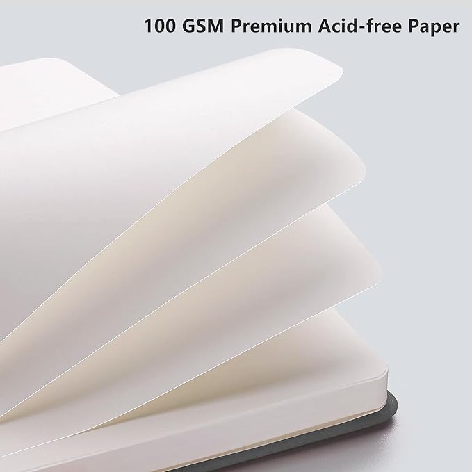 • PREMIUM PAPER: Crafted with time-resistant 100 GSM paper, our blank journal notebook preserves thoughts flawlessly while resisting ghosting/bleed-through with most pens. Acid-free material ensures long-term preservation, and its smooth surface enhances writing clarity - blending durability and premium performance