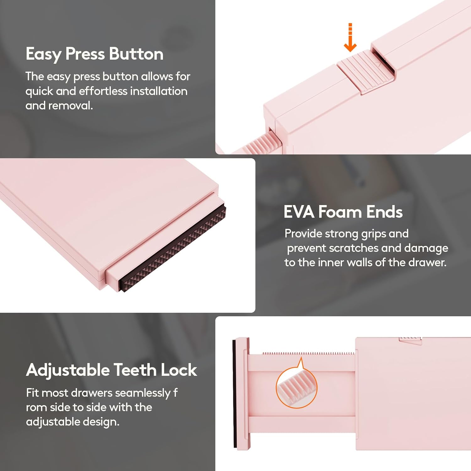 • Easy to Install: Press the top button and stretch to the desired length, then fully extend again to secure in place; The strong spring tension keeps each drawer organizer securely upright; To retract, press the top button and push the stretched side