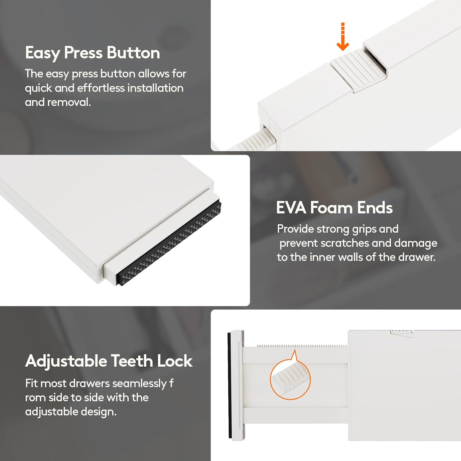• Easy to Install: Press the top button and stretch to the desired length, then fully extend again to secure in place; The strong spring tension keeps each drawer organizer securely upright; To retract, press the top button and push the stretched side