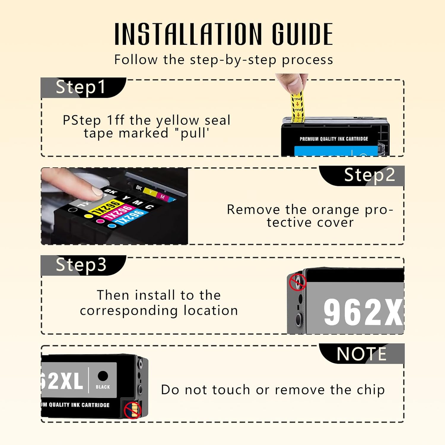 • --For hp 962xl ink cartridges combo pack / 962xl ink cartridges combo pack with latest upgraded chip --note: for hp 962xl ink cartridges combo pack latest upgrade ink cartridges100% Compatible With Printers Which Actived For HP+ service, and Compatible With *e Series Printers.Before placing an order, please ensure that your printer is compatible for hp 962XL or 962 ink cartridge to prevent any inconvenience during the printing process