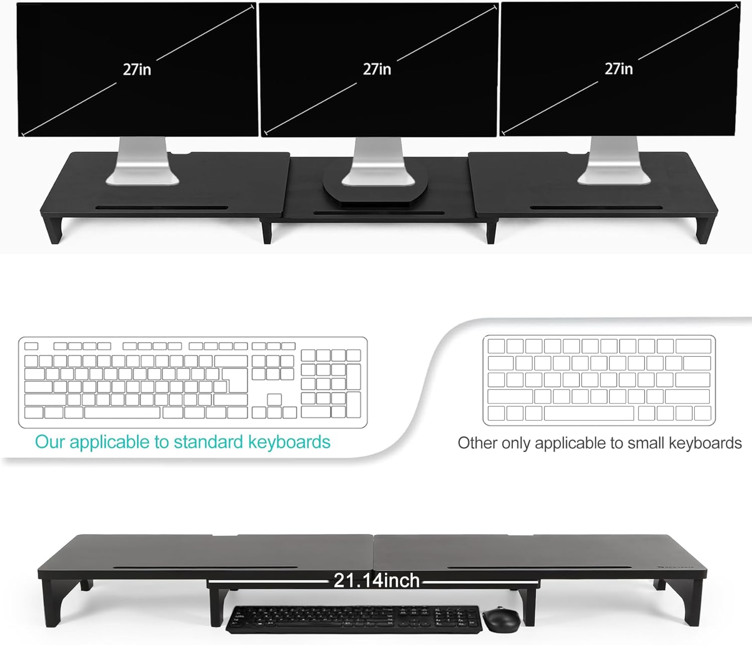 • 【Triple Monitor Stand for Desk】The three monitor stand is built up with 3 shelves, which can hold three 27" computer monitor(please refer to picture 4).Much space is available for matching multiple devices - PC/laptop/printer/books.You can also set up the desk as your need. The height of this black monitor stand is about 4in (the other black monitor stand is about 3.1in )