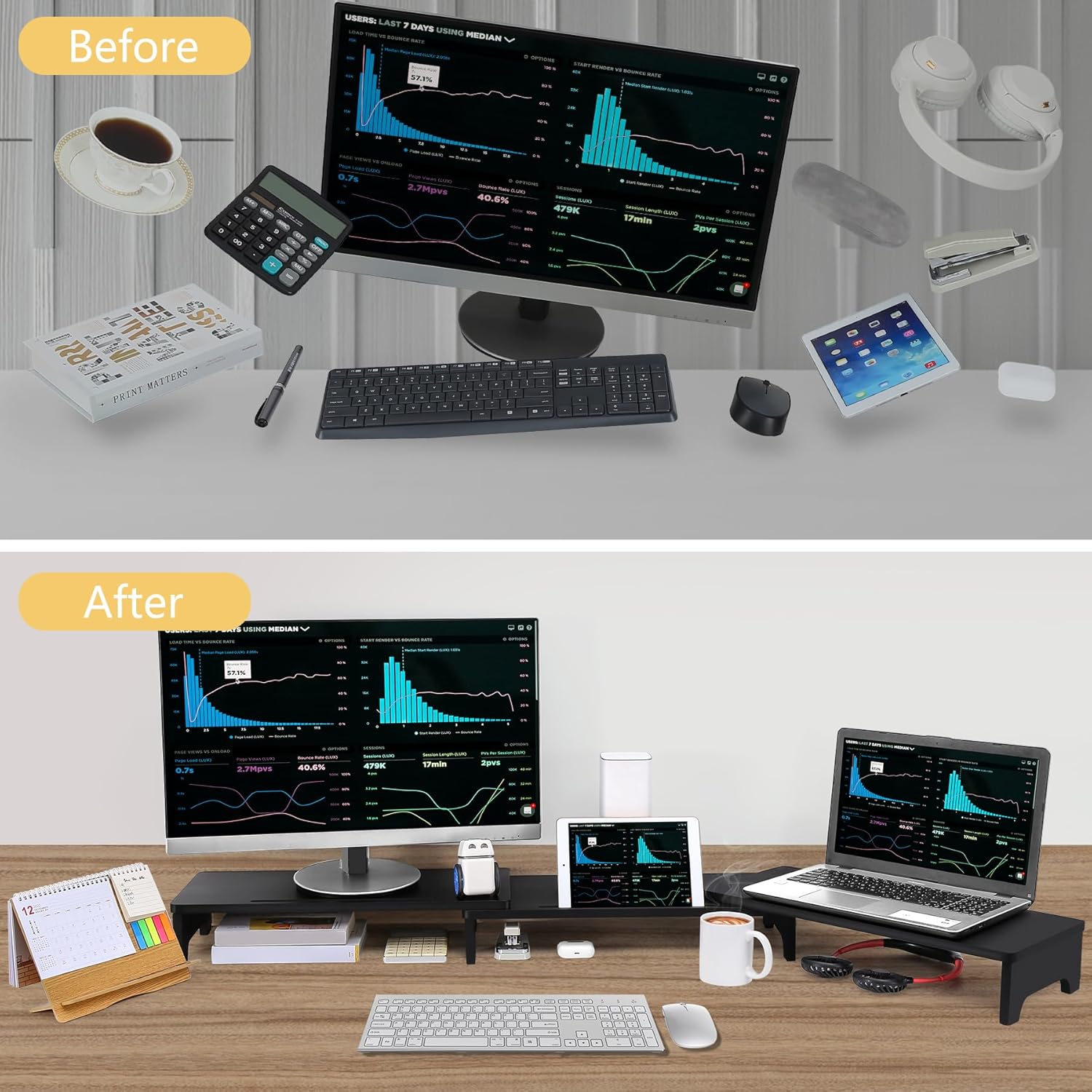 • 【Details Design for Use】Each computer monitor stand has a wide and deep tablet holder in the front of the top. It fits for pencils or phone.Also there is a cut on the back,so the cables won't be easily in a mess or become an obstacle between wall and the shelf.Moreover, the leg base is attached with anti-slip mat, enhancing the stability of the stand.If you have any problems with the assembly, please consult us!
