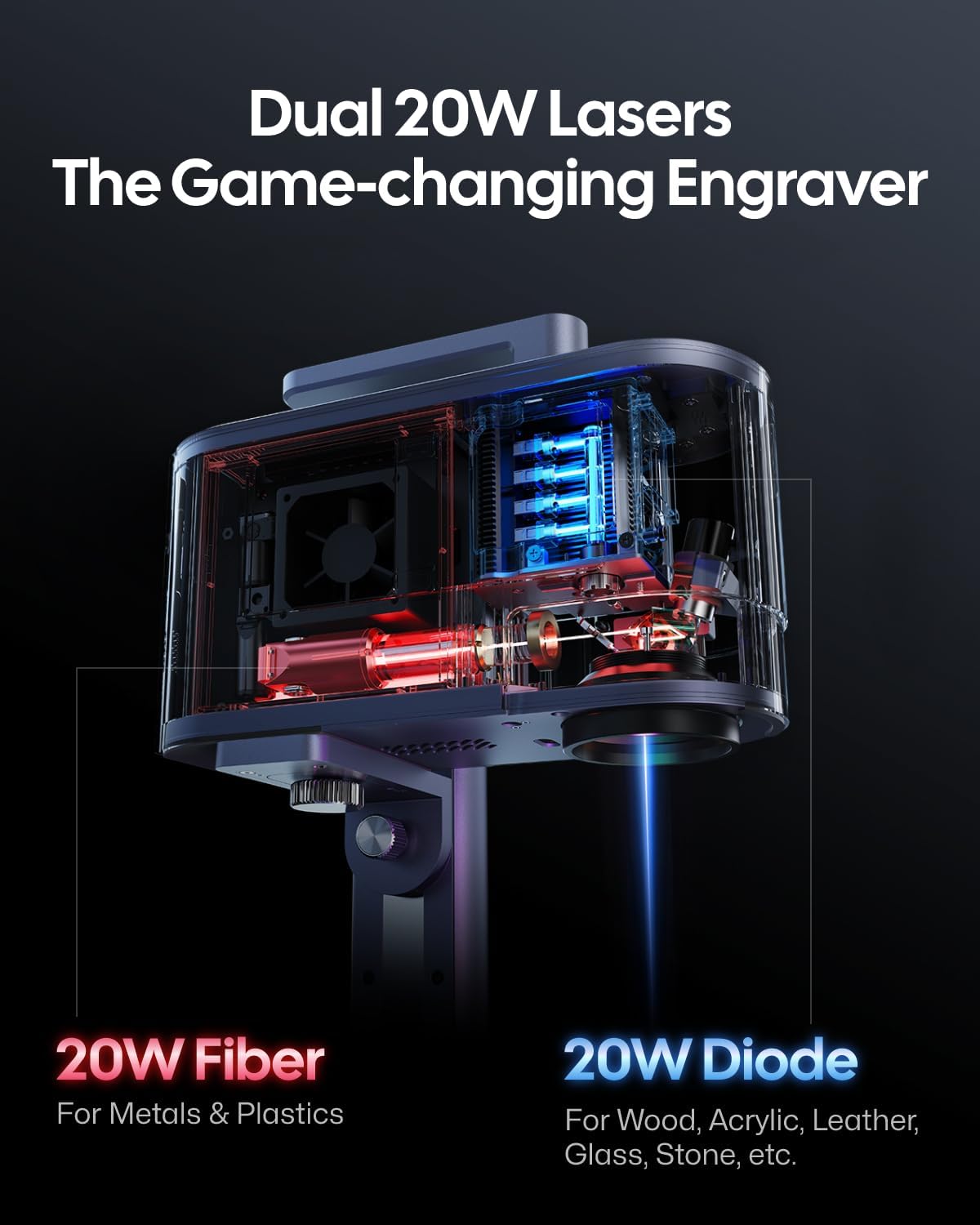 • Pro-Grade Cutting: 20mm Wood & 0.5mm Metal. 20W diode cuts 20mm wood/15mm acrylic; fiber laser slices 0.5mm brass/titanium. The only dual-laser system handling thick crafts and jewelry metals.