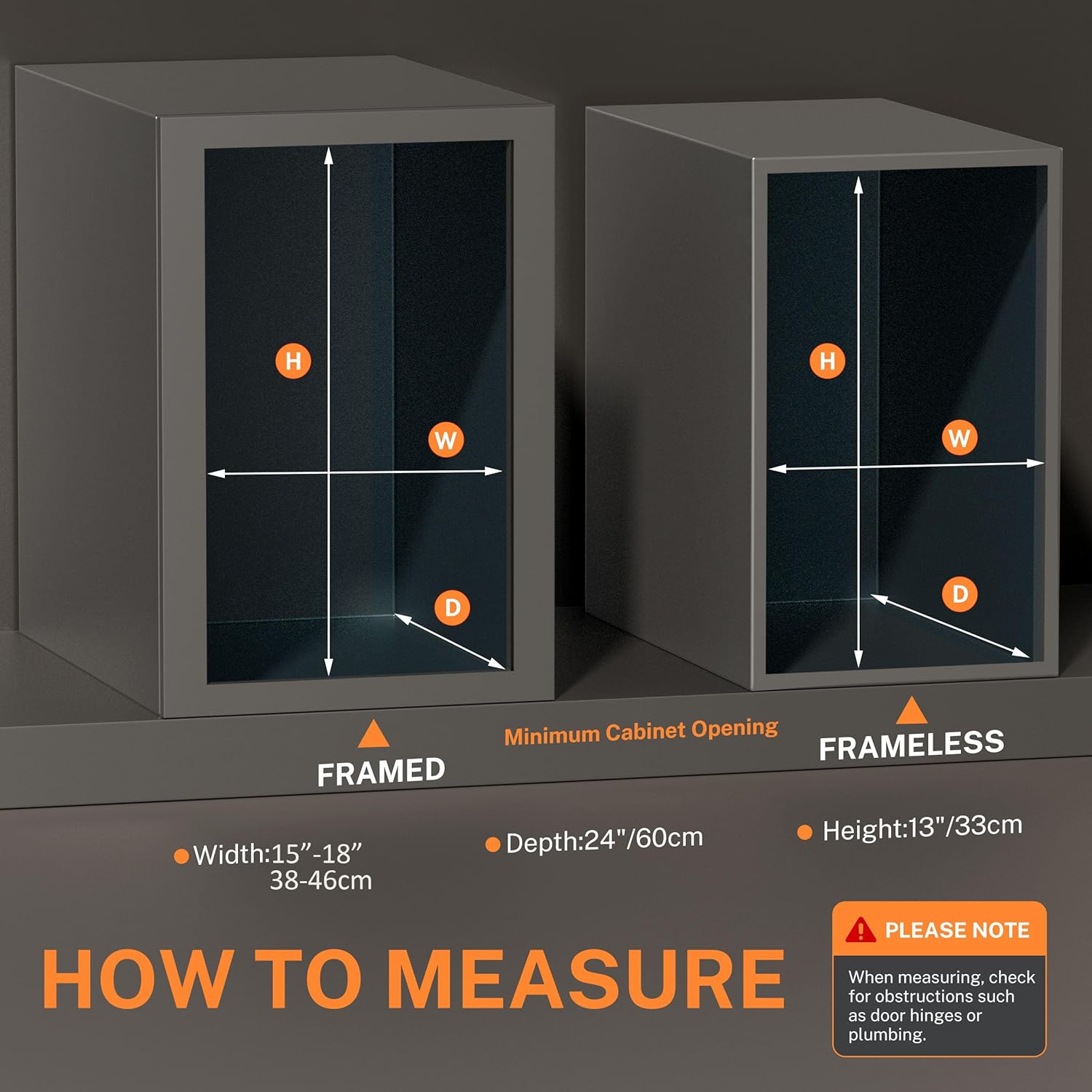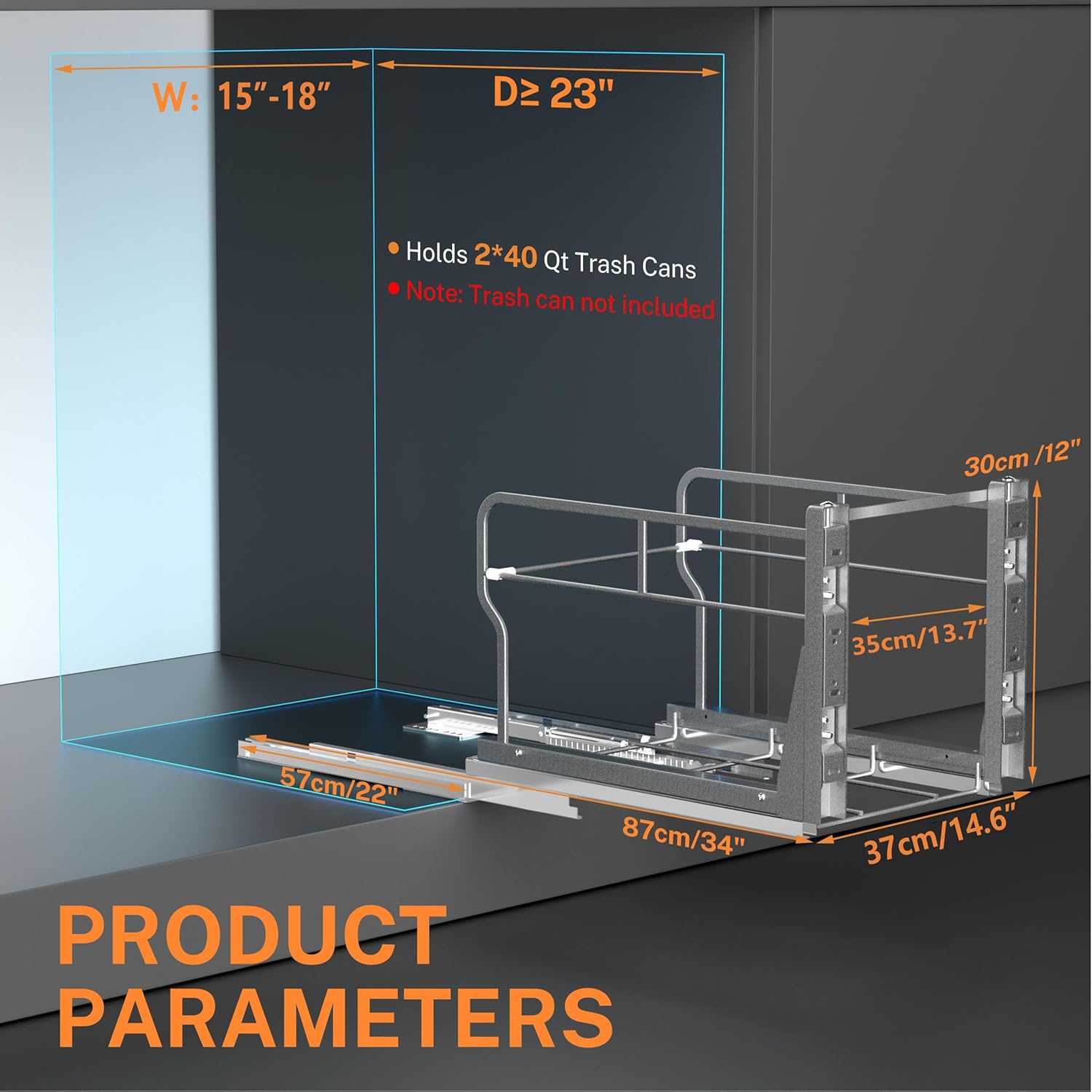 • Cabinet Requirements: Cabinet trash can pull out kit: 14.6"W x 22.2"D x 12"H; Minimum Cabinet Dimensions Required:15"-18"Wx 24"Dx 13"H. Note:The height of the trash can slider for kitchen cabinet sliding rail frame of the cabinet door should be measured according to the height of the buyer's trash can.The door mounting kit is mounted to the front of the slide frame on both sides and requires a separate tool to remove.