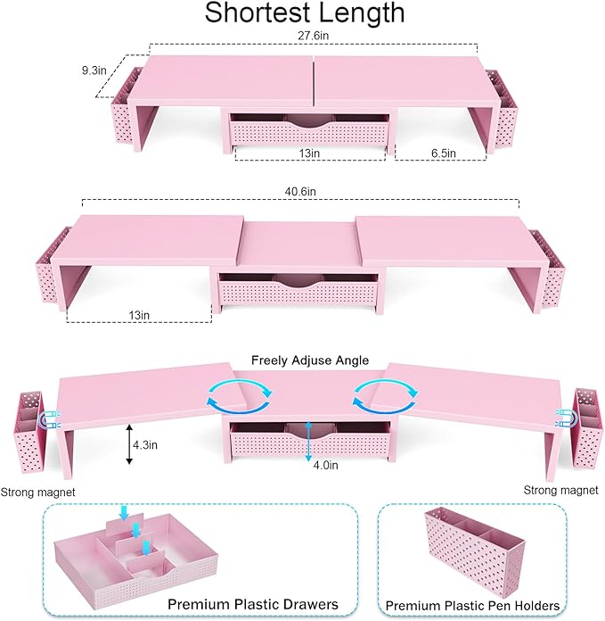 • 【Ample Storage Space】The dual monitor stand features two magnetic pen holders and a drawer, allowing you to easily organize your desk accessories and office supplies, keeping your workspace clear and tidy for easier access.