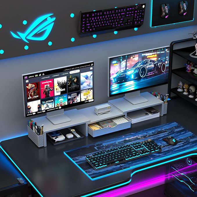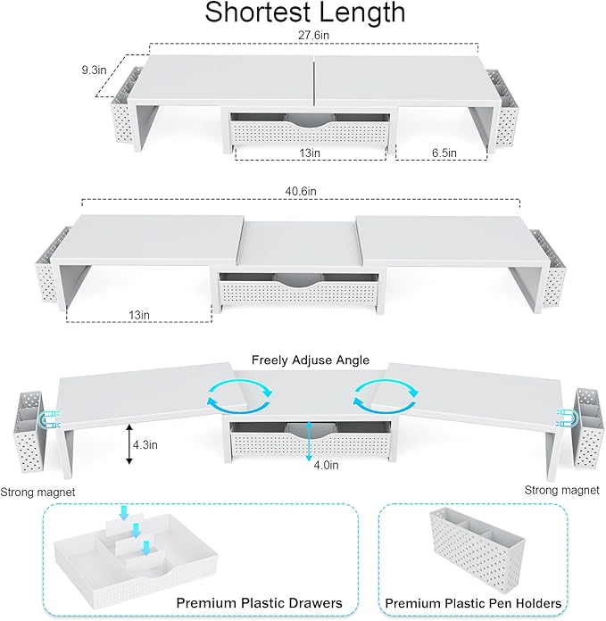 • 【Ample Storage Space】The dual monitor stand features two magnetic pen holders and a drawer, allowing you to easily organize your desk accessories and office supplies, keeping your workspace clear and tidy for easier access.