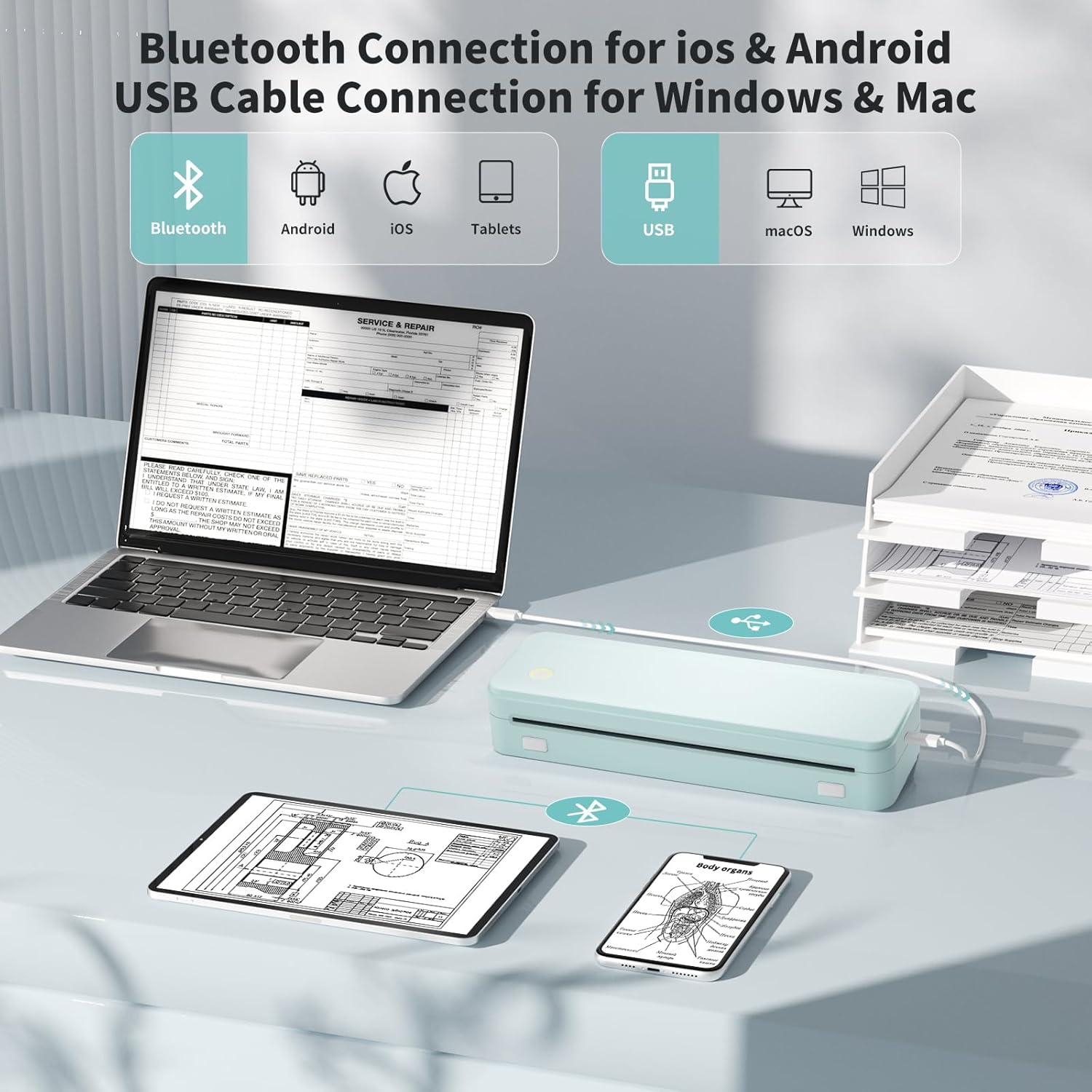 • Simple Setup via Bluetooth or USB: Connect the inkless printer effortlessly to iOS, Android, laptops, or computers. Set up in under 5 minutes with the dedicated app or driver, ensuring quick printing from your smartphone or PC.
