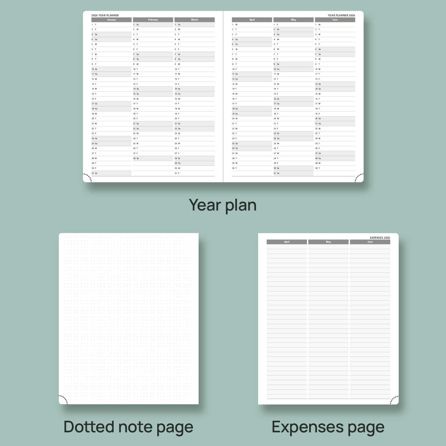 • EXTRA FUNCTION PAGES - Includes a 2025-2026 Yearly Overview, Holiday & Calendar, Monthly Expenses, Contact & Password pages, and 7 dotted notes pages for detailed jotting.