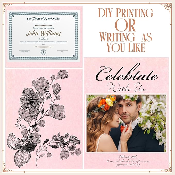 • Work As Different Things: these plain certificate papers are flexible in use, you can use them as certificate printing, wedding invitation, birthday invitation, restaurant menu, theme party decoration and so on, running smoothly in laser and inkjet printers, copiers and offset applications without jams