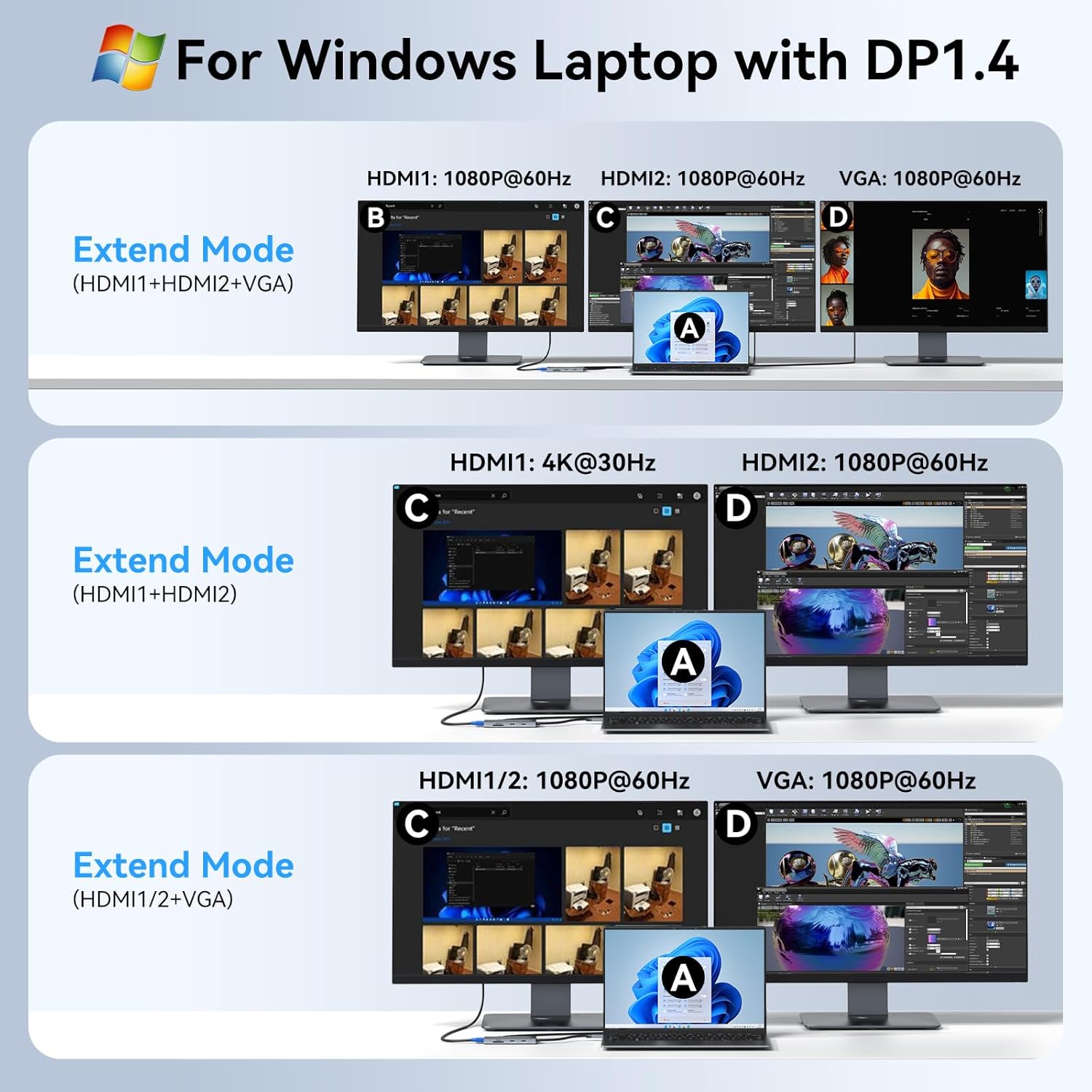 • Docking Station 3 Monitors with Ultra High-definition 4K Output: usb c hdmi hub for multiple monitors adapter with dual HDMI ports and VGA outputs. While single use HDMI port resolution up to 4K@30Hz, single use VGA up to 1080P@60Hz. Dual monitors will be 4K@30Hz and 1080P@60Hz(DP1.4). Triple monitors will be 3*1080P(DP1.4). When dp1.2, one monitor of the resolution will less than 1080P. Note:The computer docking station Not Support Using Converter