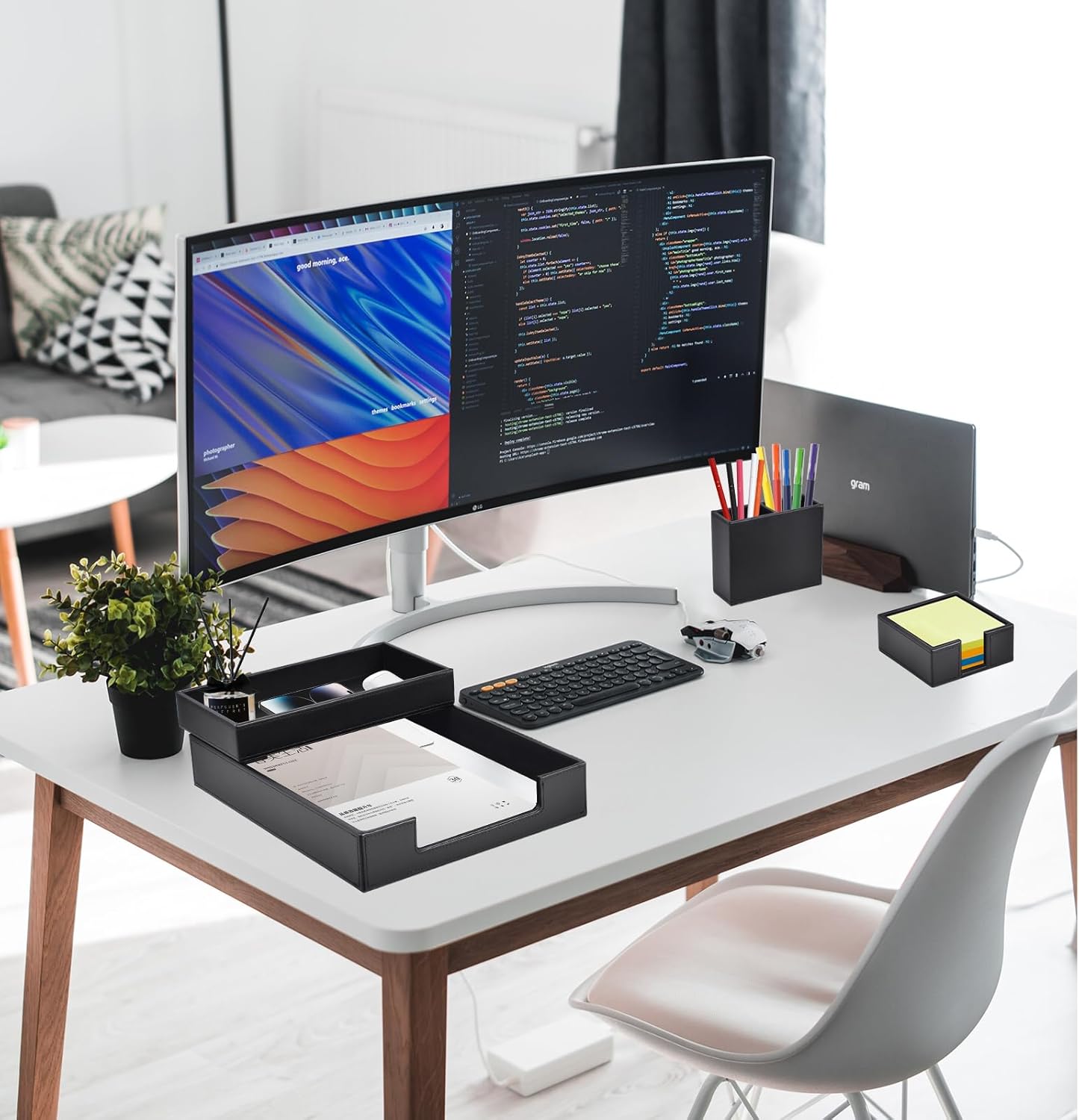• 4-Piece Office Supplies Desk Accessories Set: 1x Resume file Paper Tray, 1x Stackable Small Letter Mail Sorter Tray,1x pencil cup holder, 1x sticky note holder. Whether you seek desk accessories for men office or desk decorations for women office, This 4 piece set of desk accessories & workspace organizers fits your office theme perfectly.