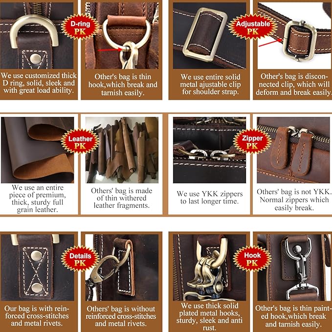• 【Sturdy Leather Briefcase Bag】This medium brief case fits most of 15.6" laptops, made of 2mm thick premium full grain leather, outfitted with ykk zippers,heavy duty hardware,tear-resistant liner and handcrafted by skilled artisans to last for decades. The leather is processed with crazy horse leather tech, featured with durability and distinctive rough weathered look as it’s new. It goes better with age,the more you use the bag, the shinier “newer” look it'll be.