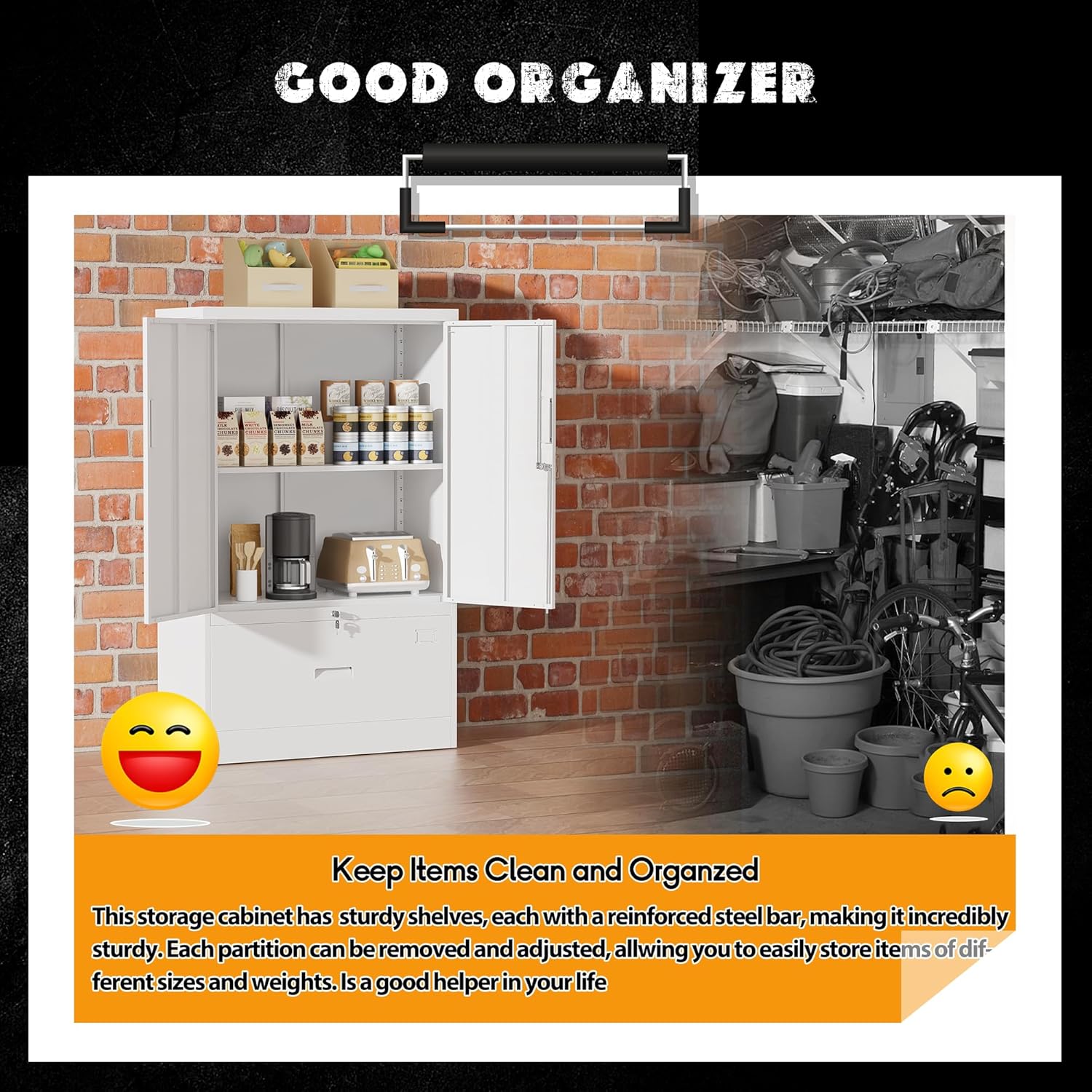 • 『Humanized and Practical Design』Intergreat garage storage cabinet door doesn't make too much noise when you close the door. If you prefer a quiet cabinet, then our file cabinet will be a great choice. The 2 doors open at an angle of 180 degrees, making it easy for you to retrieve items. To prevent accidental collisions, there are 2 reserved holes at the back of our lockable storage cabinet. When you receive the goods, it is selectively for you to fix metal storage cabinet on the wall.