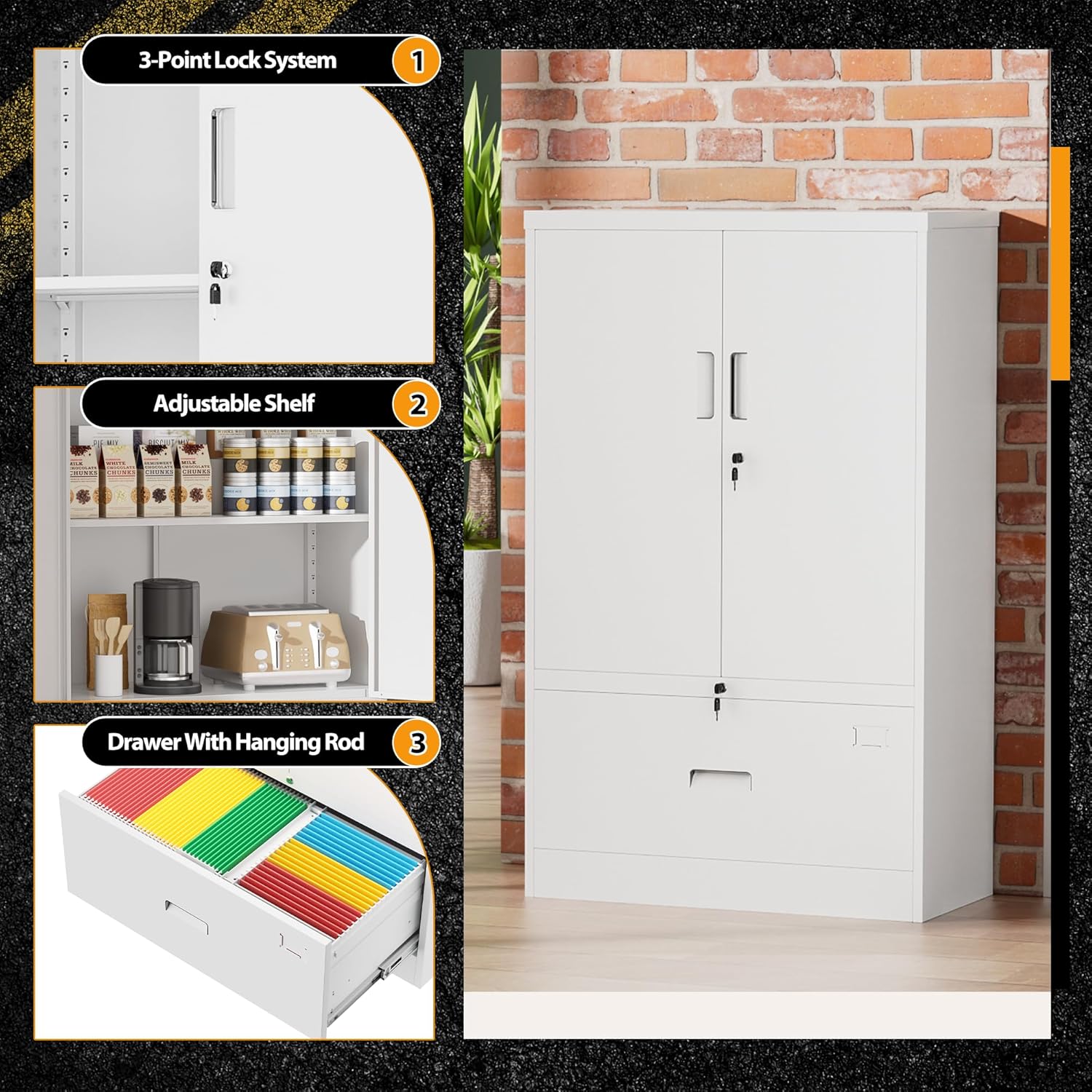• 『High Security Locking System』Intergreat lockable file cabinet adopts a 3-point lock, and the cabinet door is reinforced with steel bars, ensuring high safety. We provide 2 keys for each metal cabinet, providing excellent security protection for your personal and valuable items, making it very suitable for use at home, office, garage, and school.