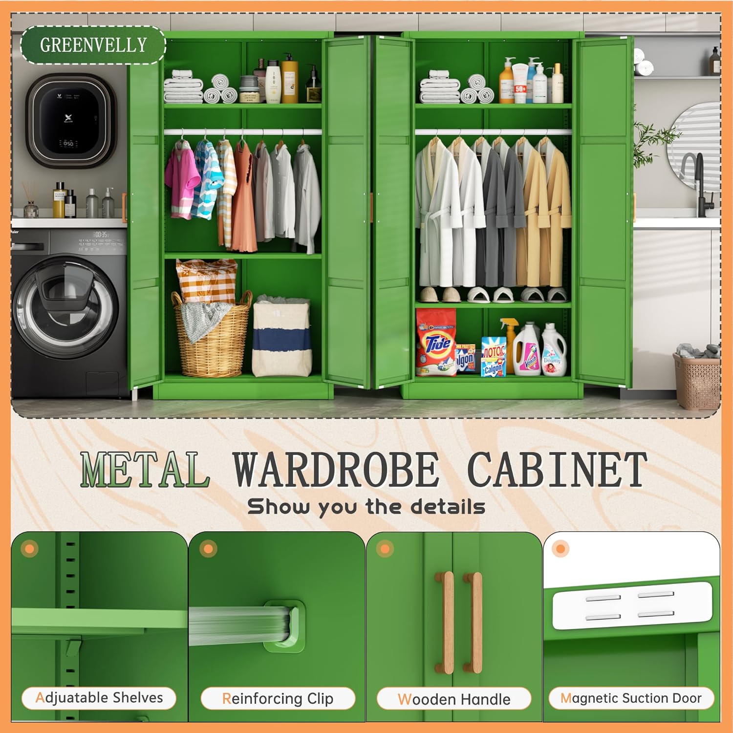 Greenvelly Metal Wardrobe Cabinet with Wooden Handle, 72" Metal Wardrobe Closet with Hanging Rods and Adjustable Shelves, Clothing Storage Closet Cabinet for Home, Office, Employee, Gym (Green)