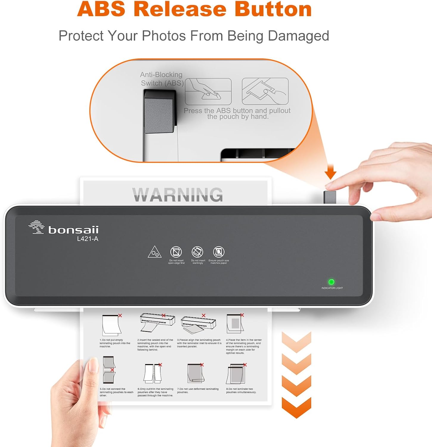 • 【ABS Jam-Free】Equipped with an advanced ABS jam-release system, simply press the button to resolve paper jams instantly. Say goodbye to frustrating interruptions during laminating.