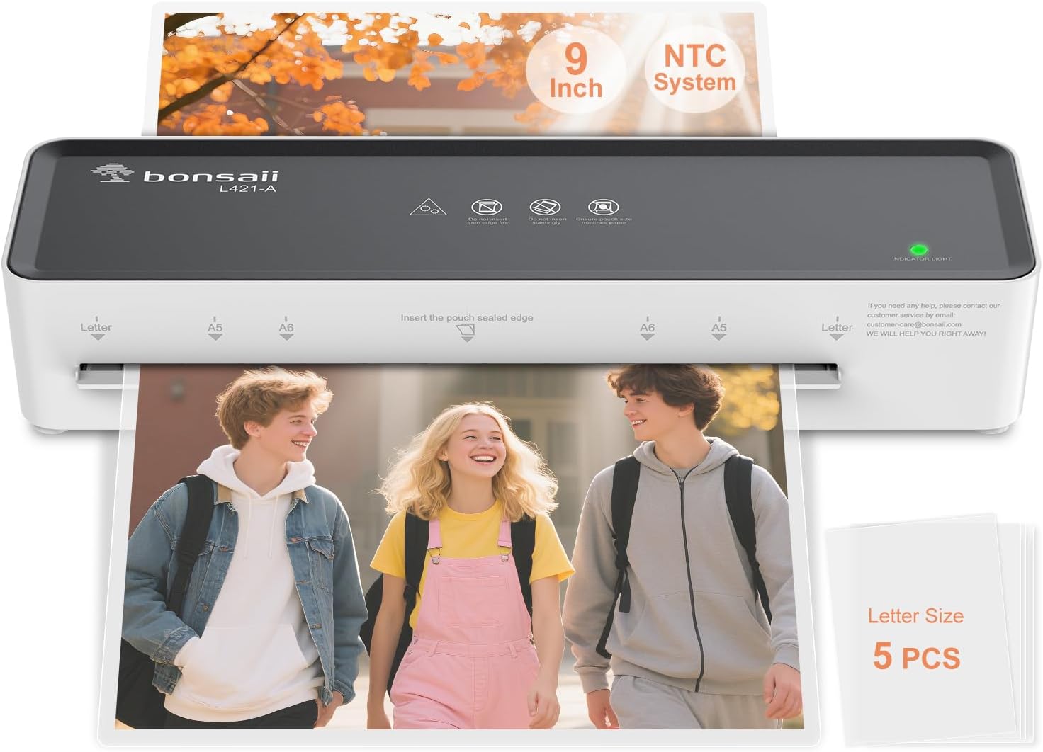 • 【Versatile & Compact Design】The Bonsaii 9-inch laminator comes with 5 laminating pouches for instant use. Its compact design (12.65"L x 3.74"W) ensures easy storage and portability, making it ideal for home, classroom, or office lamination tasks.
