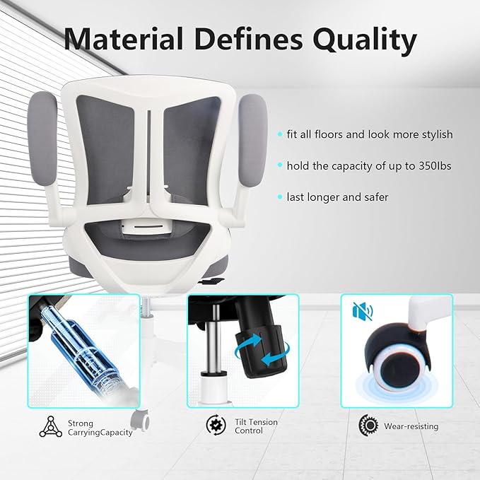 Ergonomic Comfort Home Desk Office Chair, Mid Back Computer Gaming Chair with Wheels, Adjustable Height, Lumbar Support, Flip-up Armrest with 350LBS Capacity (White Grey)