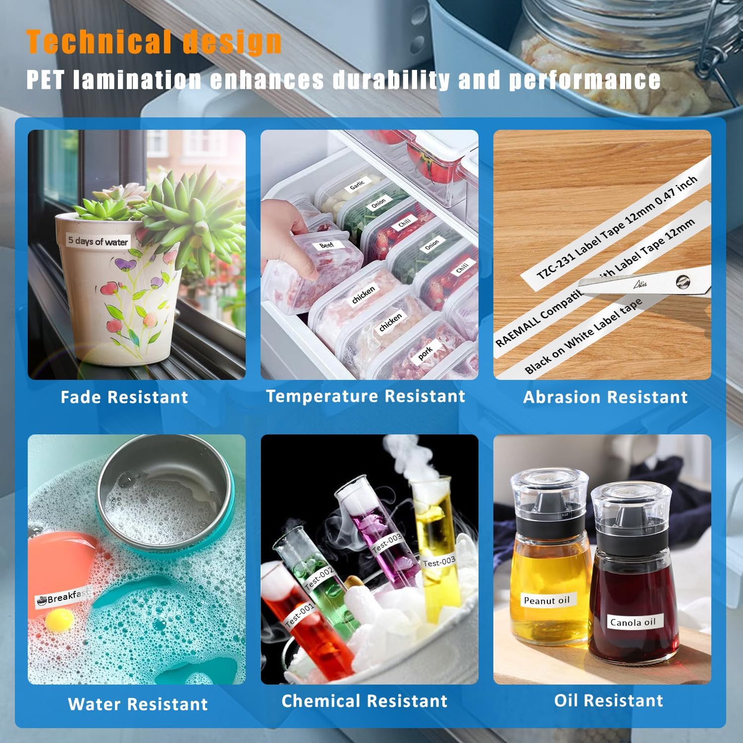 • Laminated and Long-lasting: Replace for Brother TZe TZ Tape 12mm 0.47 laminated white label maker refill tape with the feature of water resistant, mudge proof, temperature resistant, fade resistant, oil resistant, abrasion resistant, chemical resistant, strong adhesion, it can be used even in harsh environment