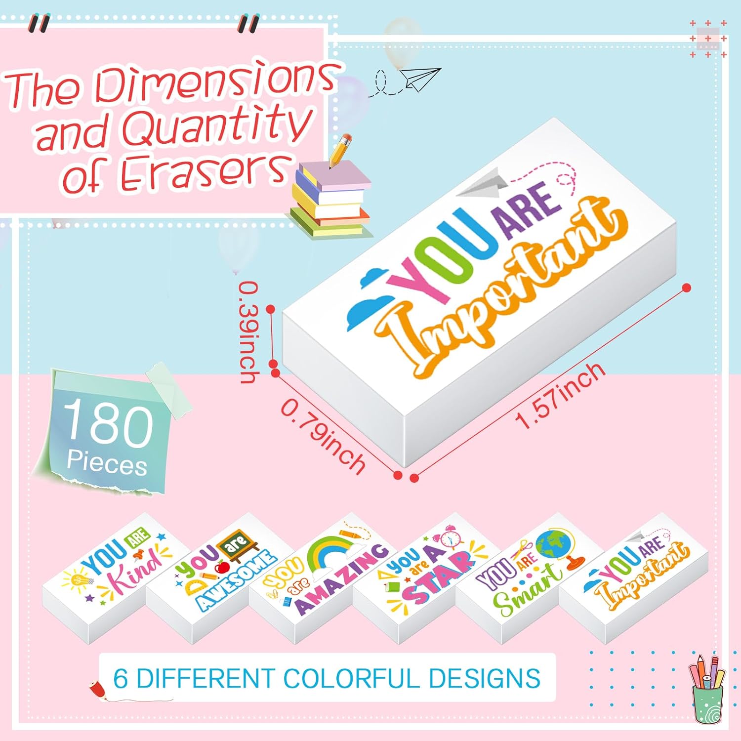 • Generous Packaging: the package includes 180 inspirational erasers bulk, ensuring that you never run out; Whether for personal use or a classroom setting, this bulk printed with 6 different motivational designs, satisfying all your erasing needs for a long time