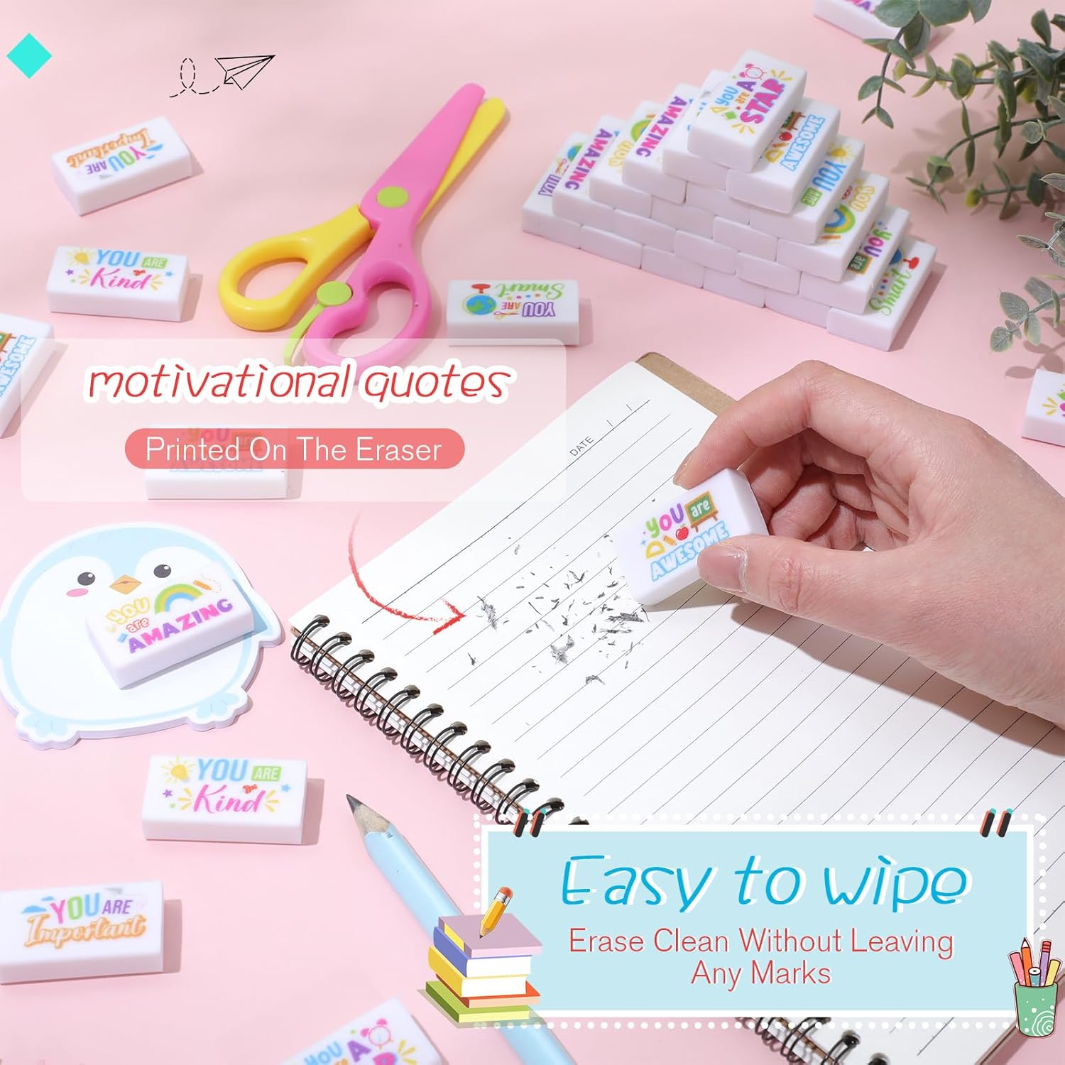 • Versatile Usage: apart from erasing pencil marks effectively, their attractive design and motivational messages make them nice pieces for various uses; The inspirational pencil erasers can be applied for decorations, party favors, or as motivational tools in classrooms, a versatile addition to any stationery collection